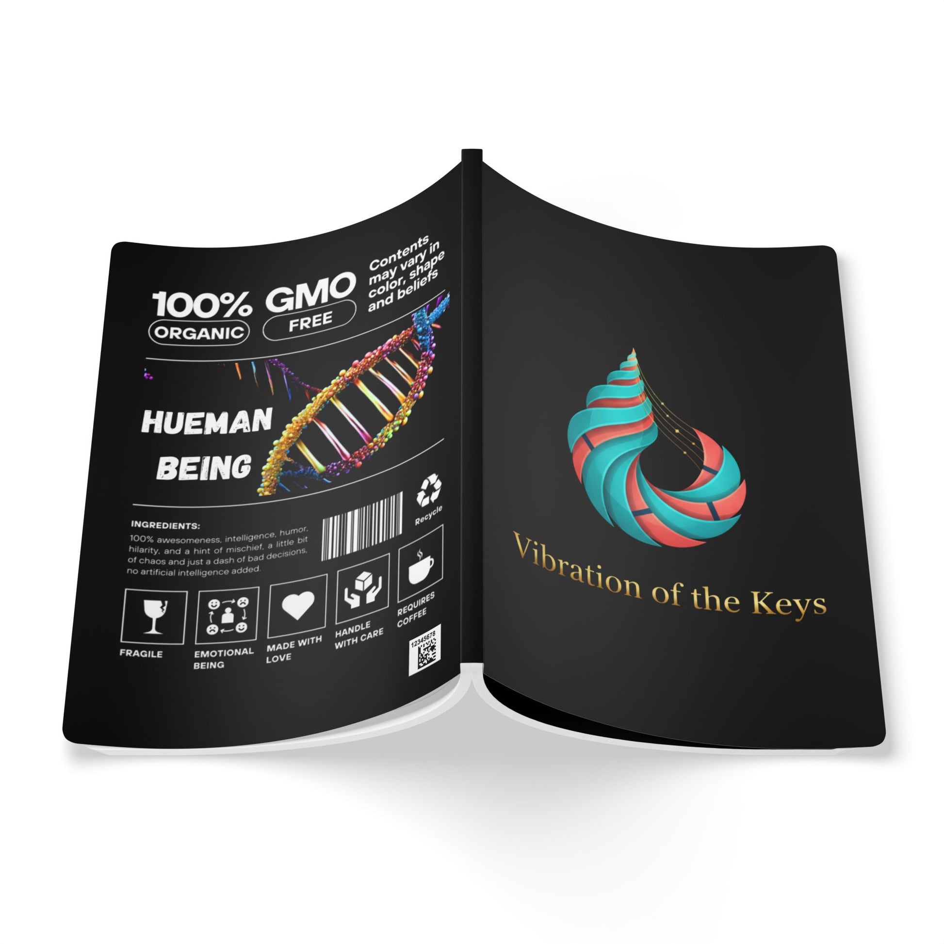 Este cuaderno de tapa blanda irradia una inteligencia sutil y lúdica: una cubierta negra mate, esquinas redondeadas y un emblema llamativo y colorido que evoca la música hecha visible. El símbolo en espiral, similar a una cinta, y el título dorado «Vibración de las Teclas» en la portada invitan a la creatividad enfocada; la contraportada imita ingeniosamente una etiqueta de producto, con una vibrante hélice de ADN y un texto irónico que parece un guiño a las mentes curiosas. Con un tamaño de 14,6 x 20,3 cm, cabe en mochilas y bolsos, y se abre a páginas gruesas de 120 g/m² que admiten tinta, bolígrafos de gel y acuarelas ligeras sin traspasar. Las hojas perforadas facilitan arrancar bocetos, letras de canciones o listas de la compra, y la opción de 100 o 200 páginas te permite elegir la duración de la historia. Seis páginas interiores personalizables te ofrecen diseños de acceso rápido —seguimiento, sugerencias o partituras— para que el cuaderno se adapte a la práctica, la planificación o el ocio. Ensamblada en EE. UU. con una impresión vibrante y un suave acabado satinado, esta libreta se siente artesanal pero a la vez está lista para el uso diario.