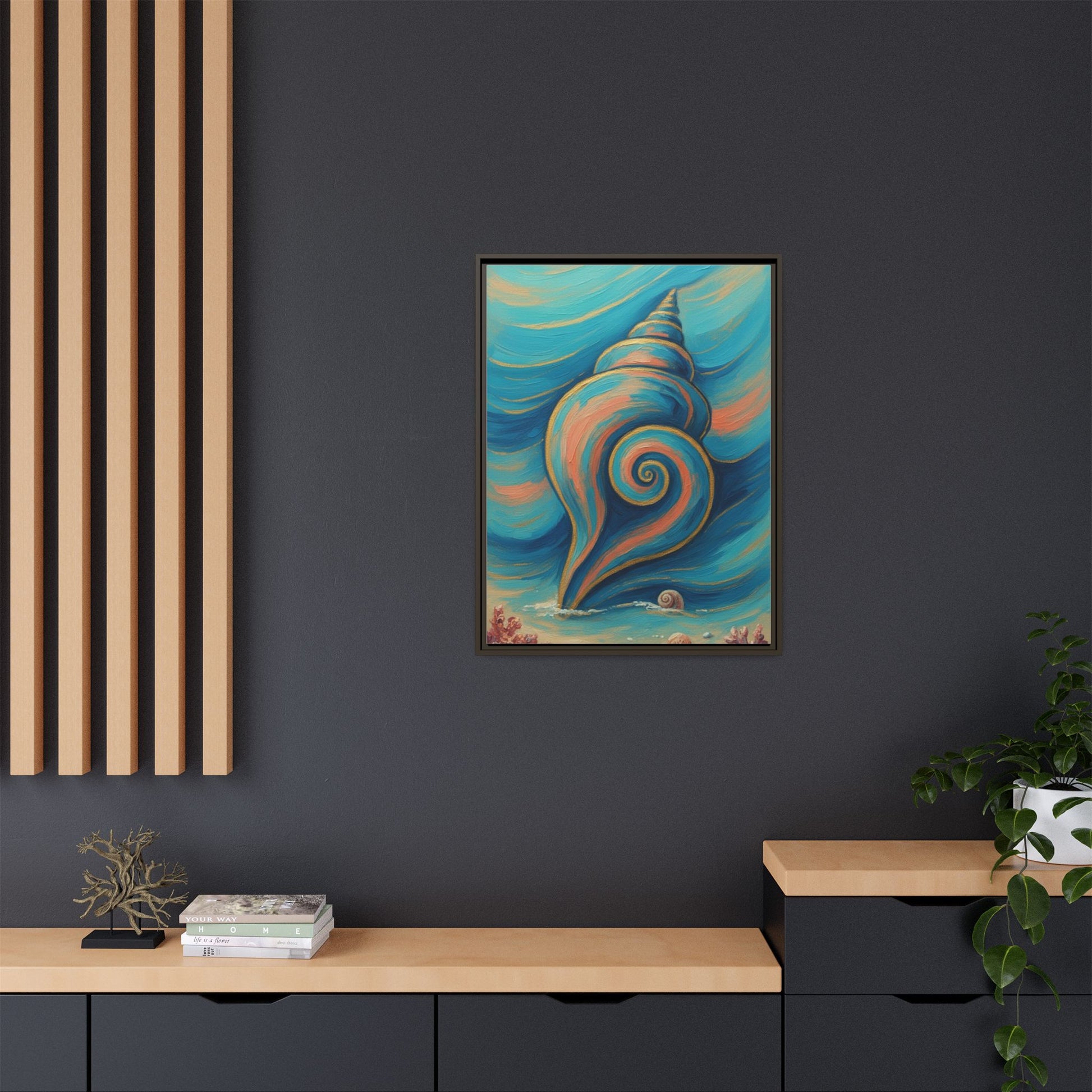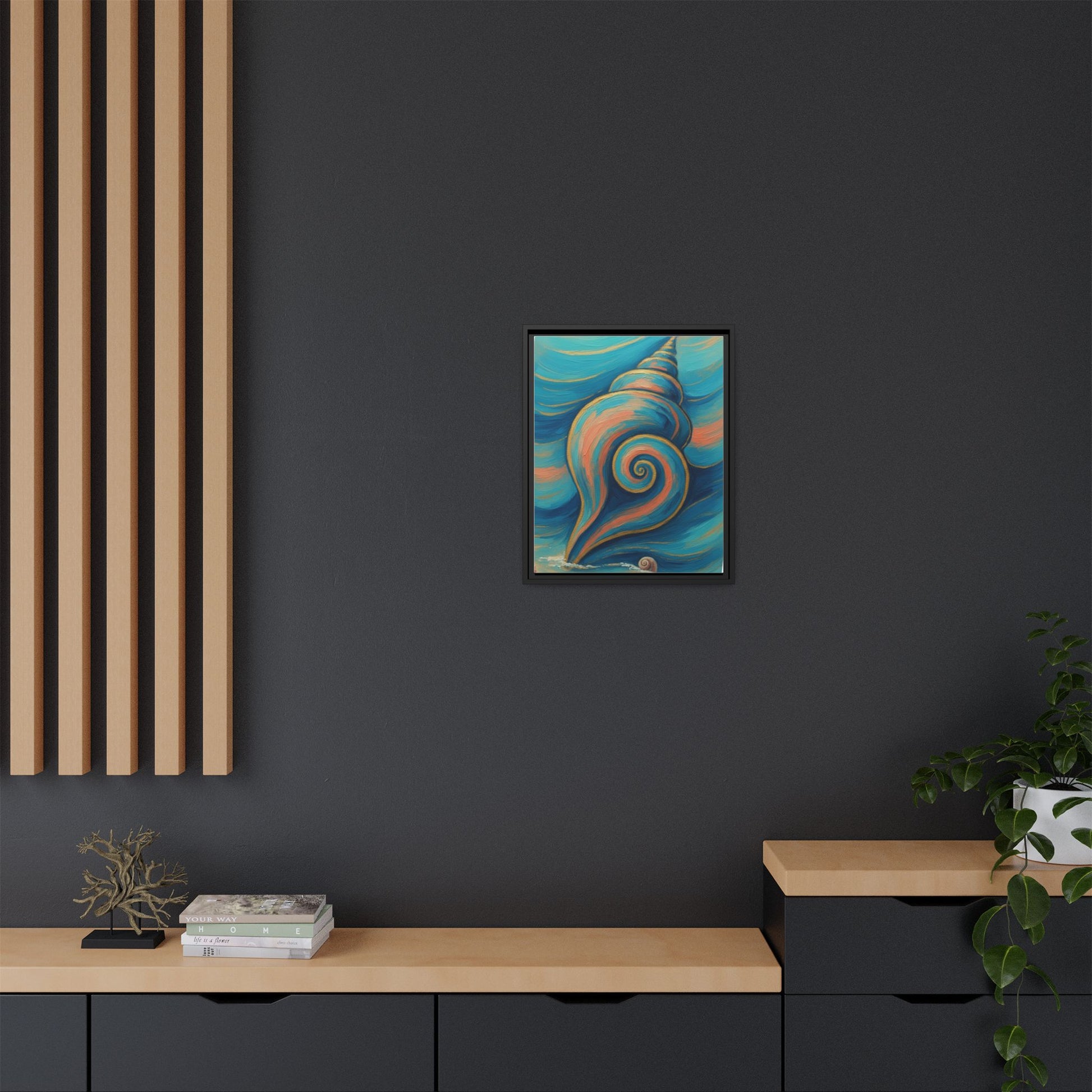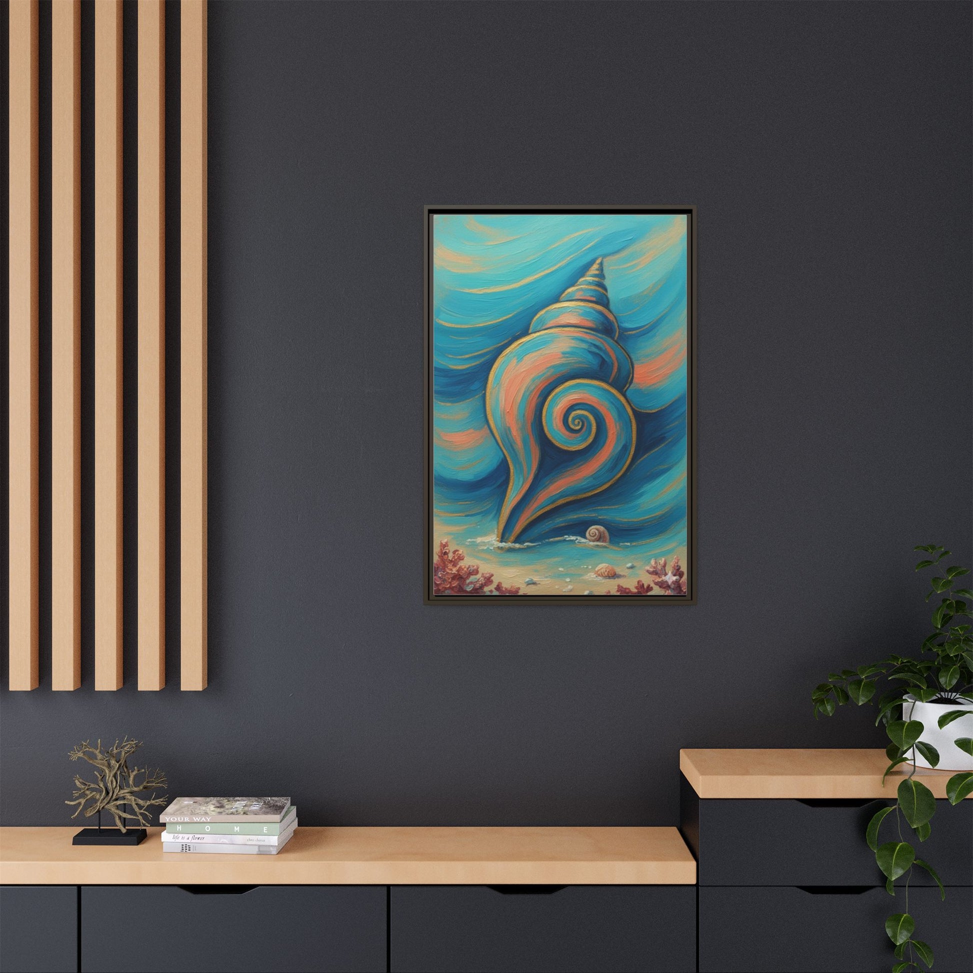 This framed matte canvas brings a gentle ocean dream into your space. Soft, swirling brushstrokes of teal, coral and deep blue form a stylized spiral shell that feels both meditative and alive. Mounted on a slim pine frame with a velvety matte finish, the print reduces glare and emphasizes the layered texture and rich hues. It hangs quietly in a reading nook, brightens a coastal hallway, or anchors a gallery wall with a calm, seaside mood. The materials are sustainably sourced and printed with low-VOC, latex-based inks, so the artwork looks radiant while staying conscious of home and planet.