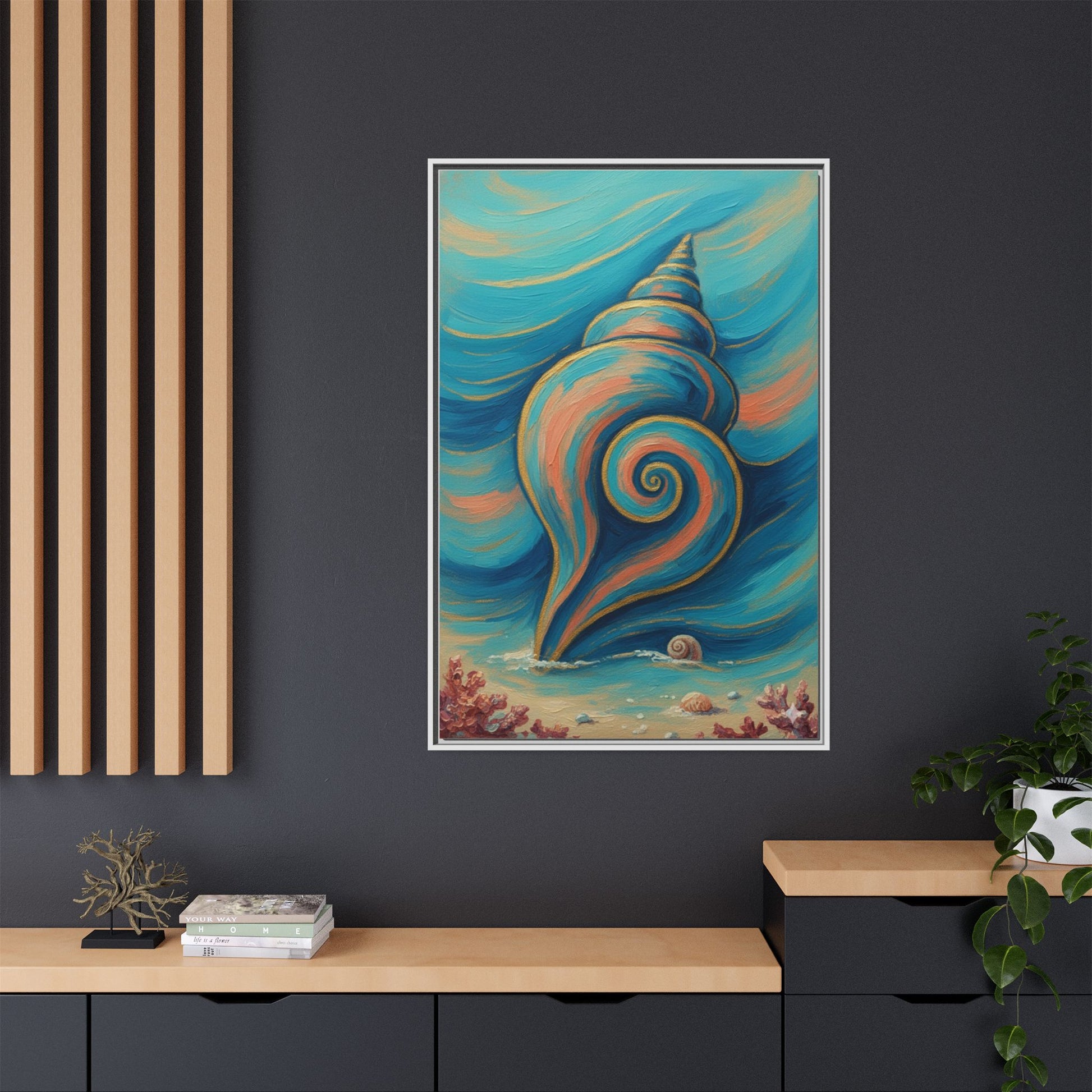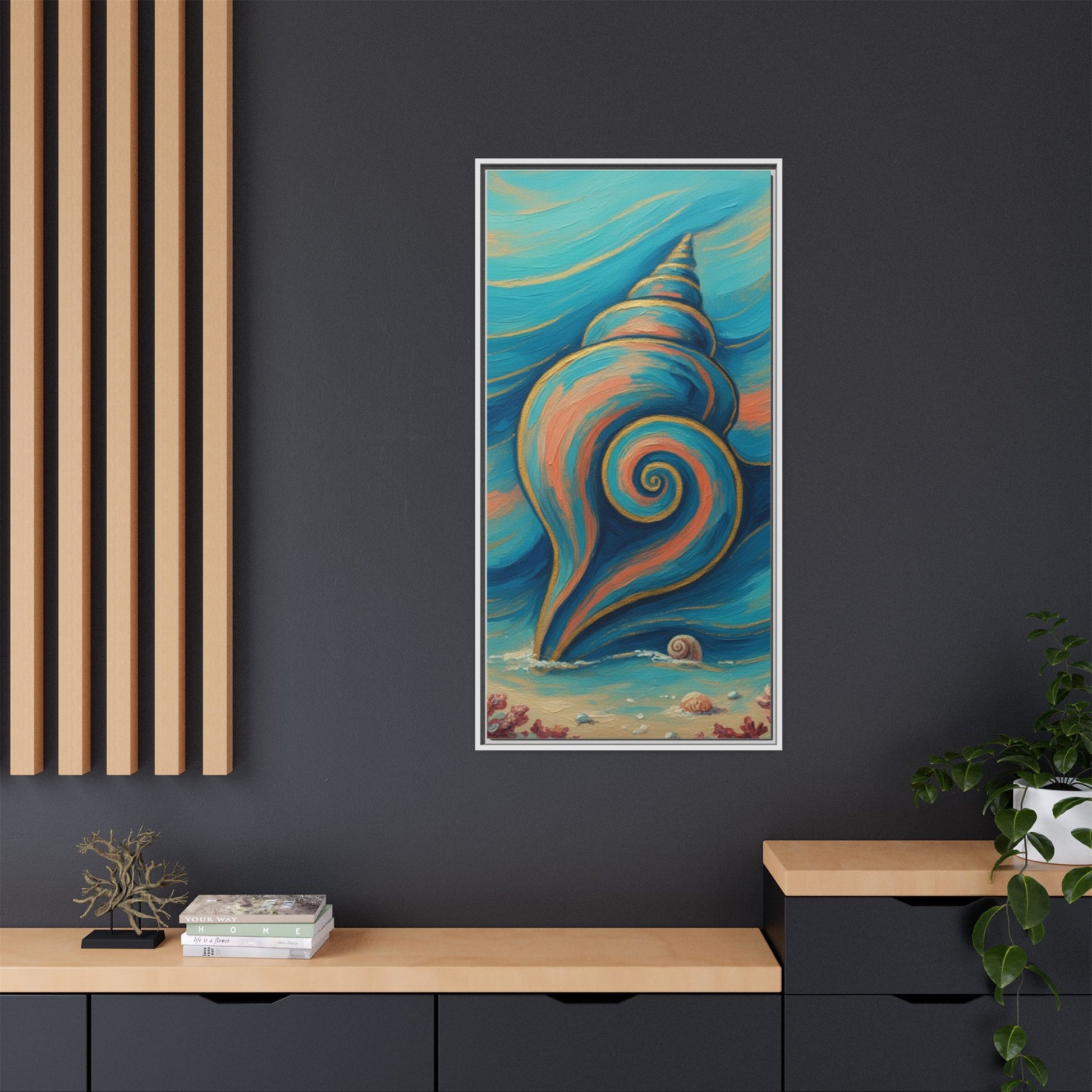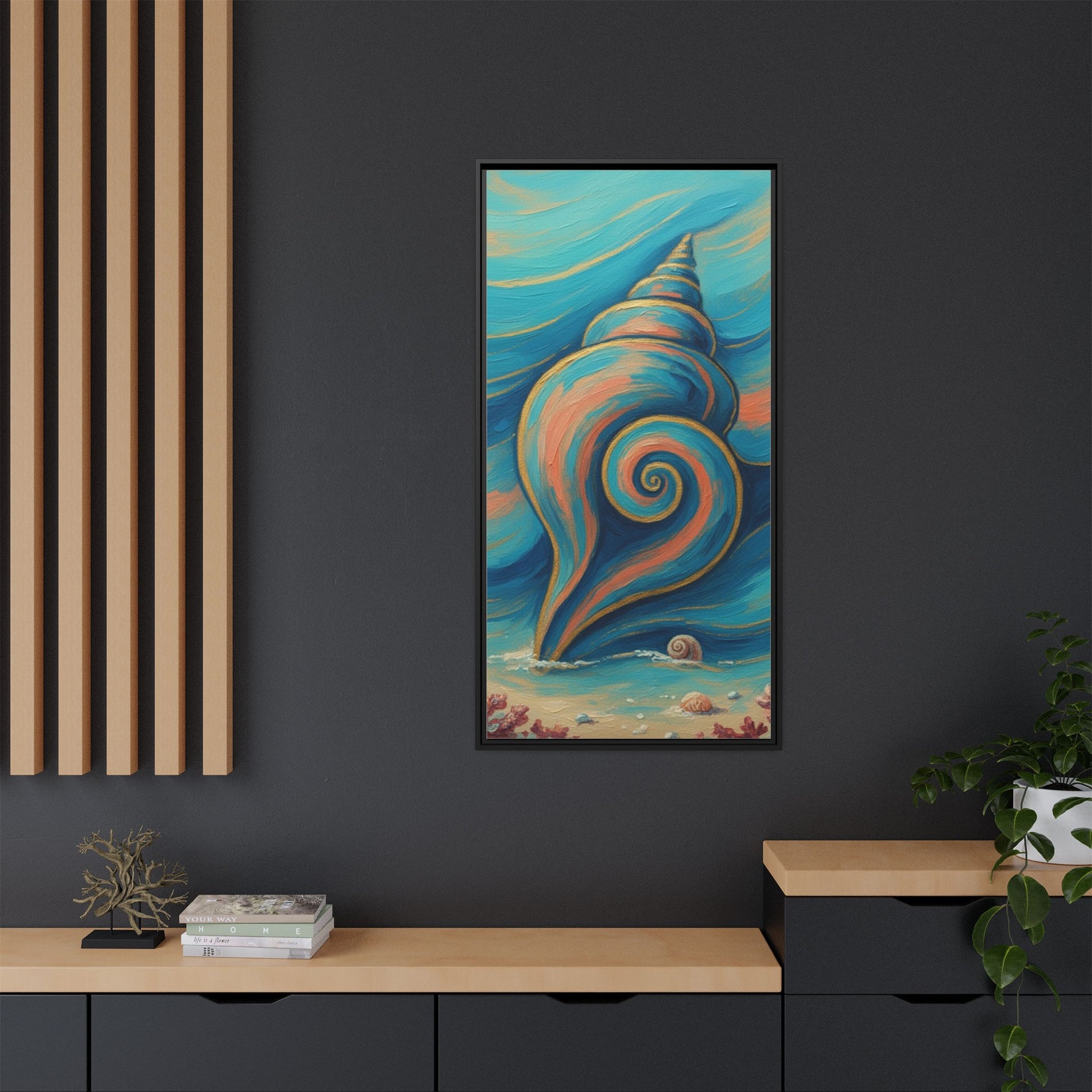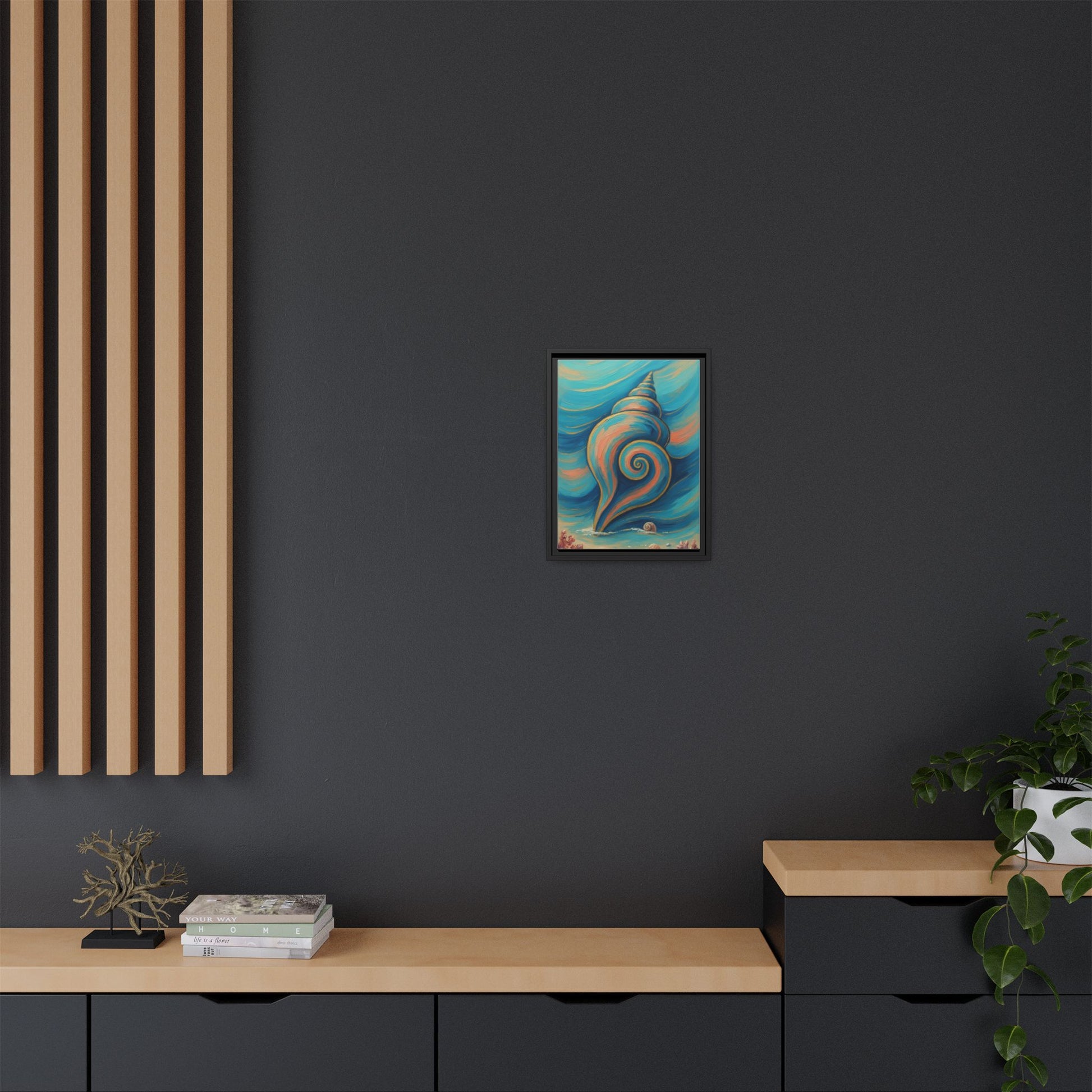 This framed matte canvas brings a gentle ocean dream into your space. Soft, swirling brushstrokes of teal, coral and deep blue form a stylized spiral shell that feels both meditative and alive. Mounted on a slim pine frame with a velvety matte finish, the print reduces glare and emphasizes the layered texture and rich hues. It hangs quietly in a reading nook, brightens a coastal hallway, or anchors a gallery wall with a calm, seaside mood. The materials are sustainably sourced and printed with low-VOC, latex-based inks, so the artwork looks radiant while staying conscious of home and planet.
