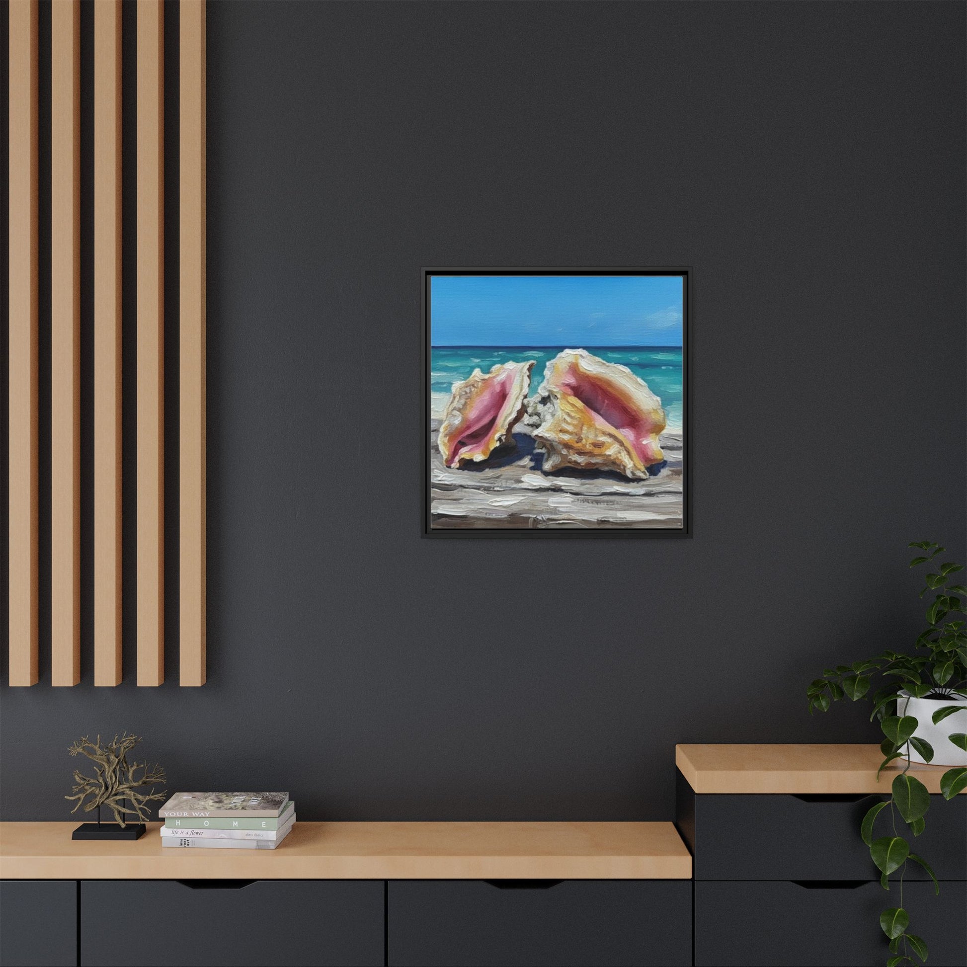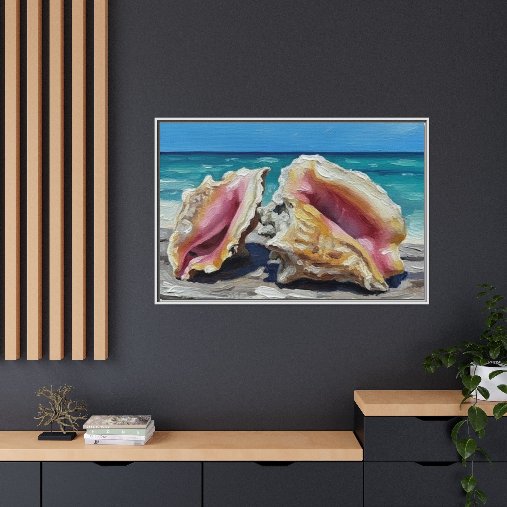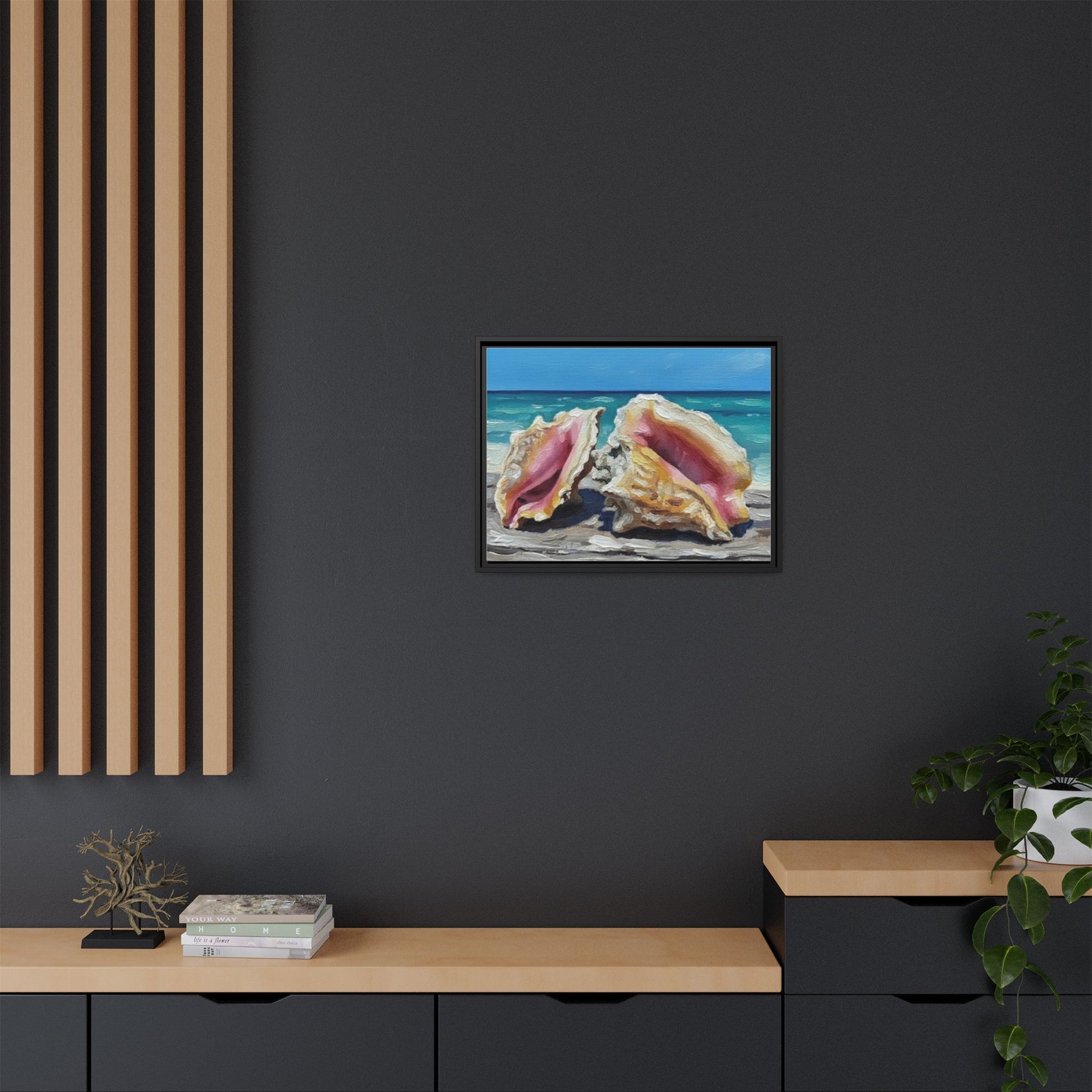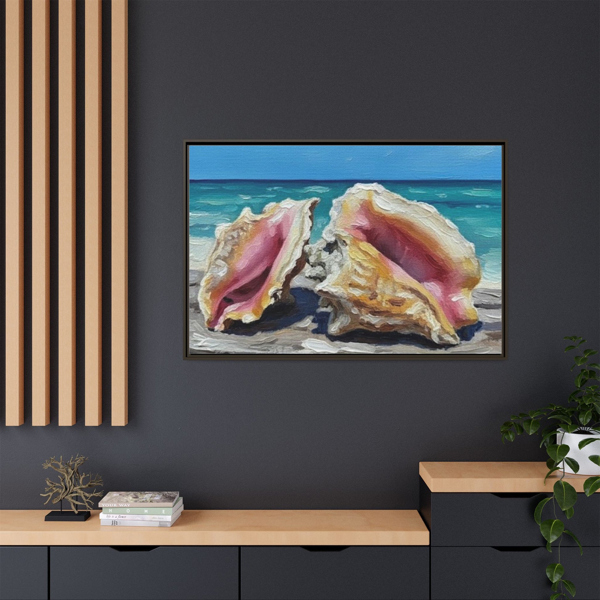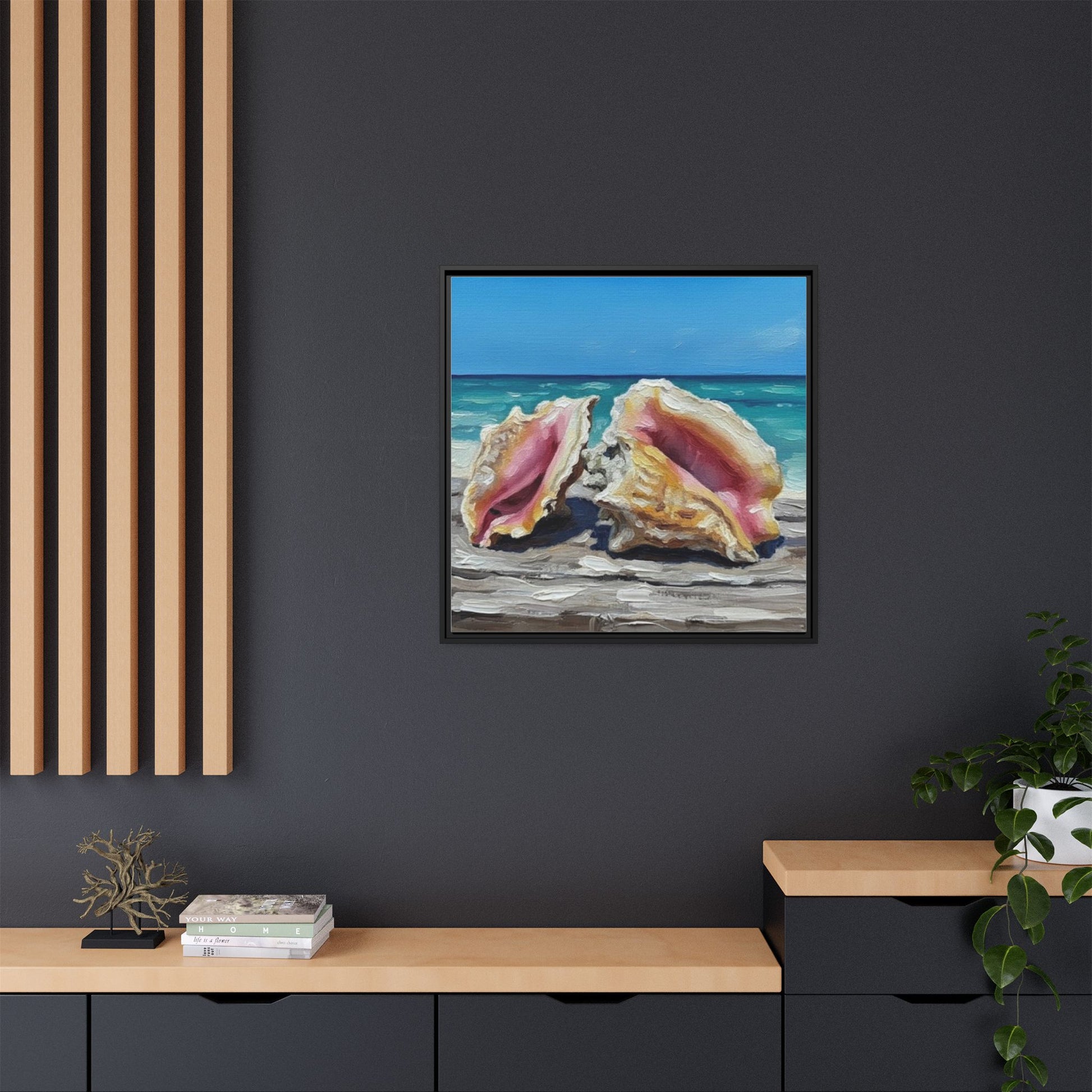 Bring a quiet shore into your home with this framed matte canvas print. The soft brushstrokes and salt-sweet palette — seafoam greens, sunlit sand, and the warm pinks inside twin conch shells — create a calming focal point that feels like a memory of afternoon tide pools. The slim black frame gives the piece a contemporary edge while letting texture and color breathe. Hang it above a console, beside a reading nook, or in a bathroom to evoke slow, coastal afternoons and the sound of waves just out of sight.