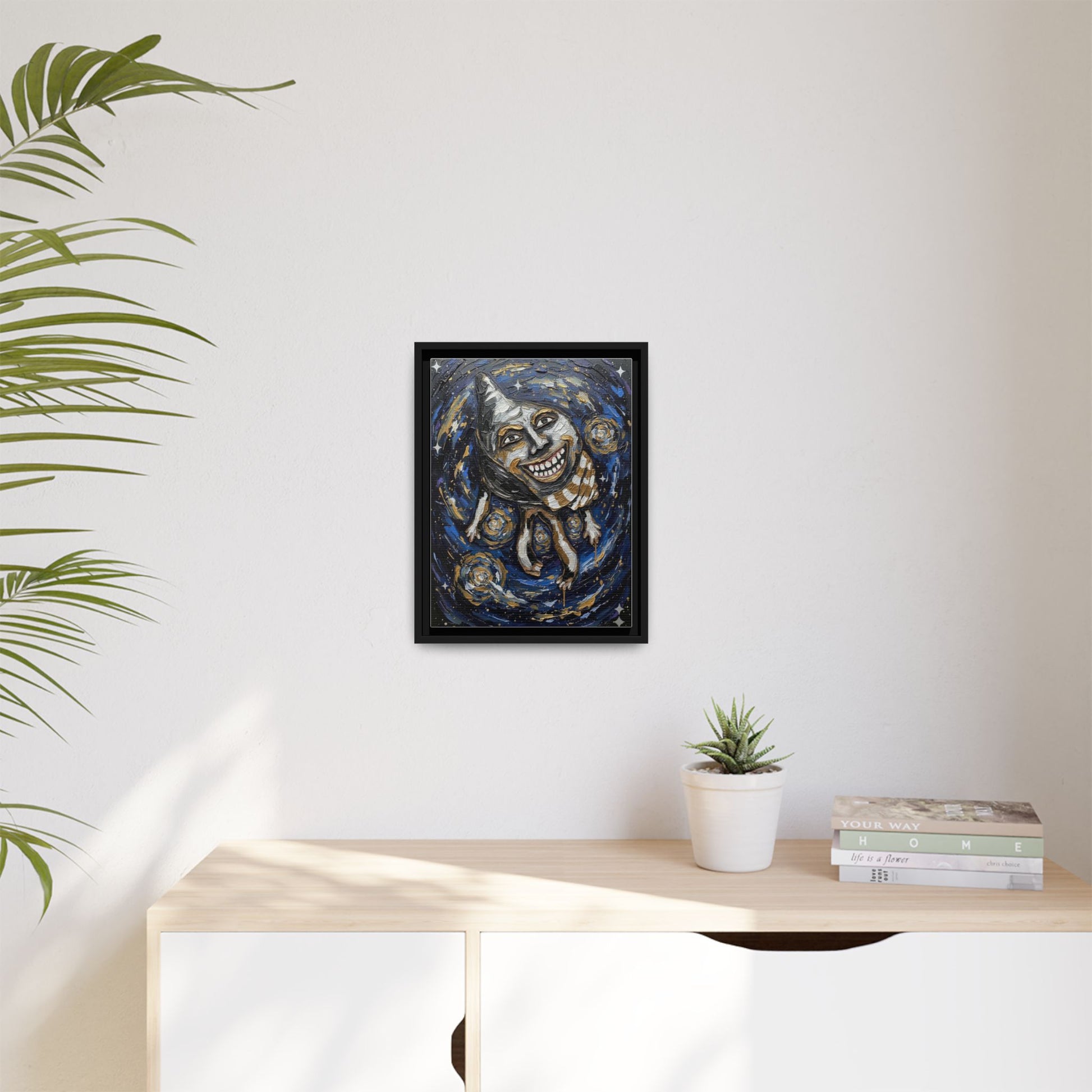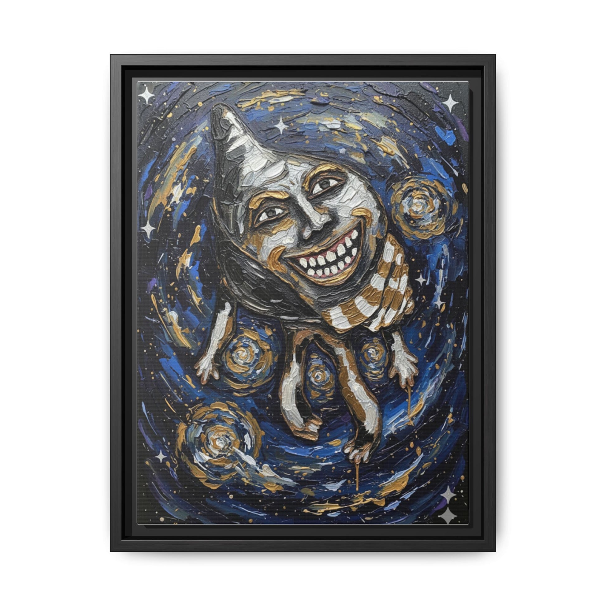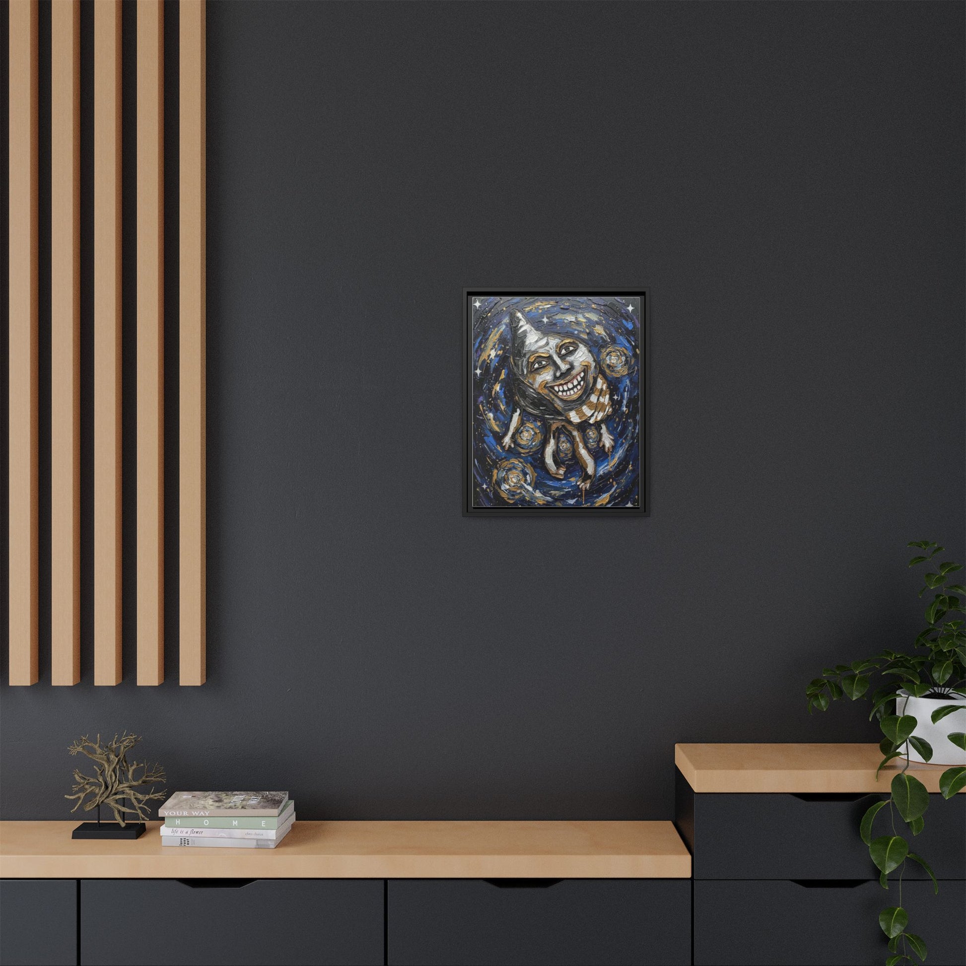 A matte, framed canvas print that brings bold, painterly energy to any wall. This piece features deep indigo swirls, gold accents, and a striking, surreal conch figure rendered in expressive brushstrokes — a dramatic focal point for eclectic interiors. The black pine frame gives the artwork a contemporary, gallery-ready edge while the matte canvas surface keeps glare low and colors rich. Hang it in a reading nook, hallway, or creative studio to introduce movement and a slightly otherworldly mood that sparks conversation and imagination.