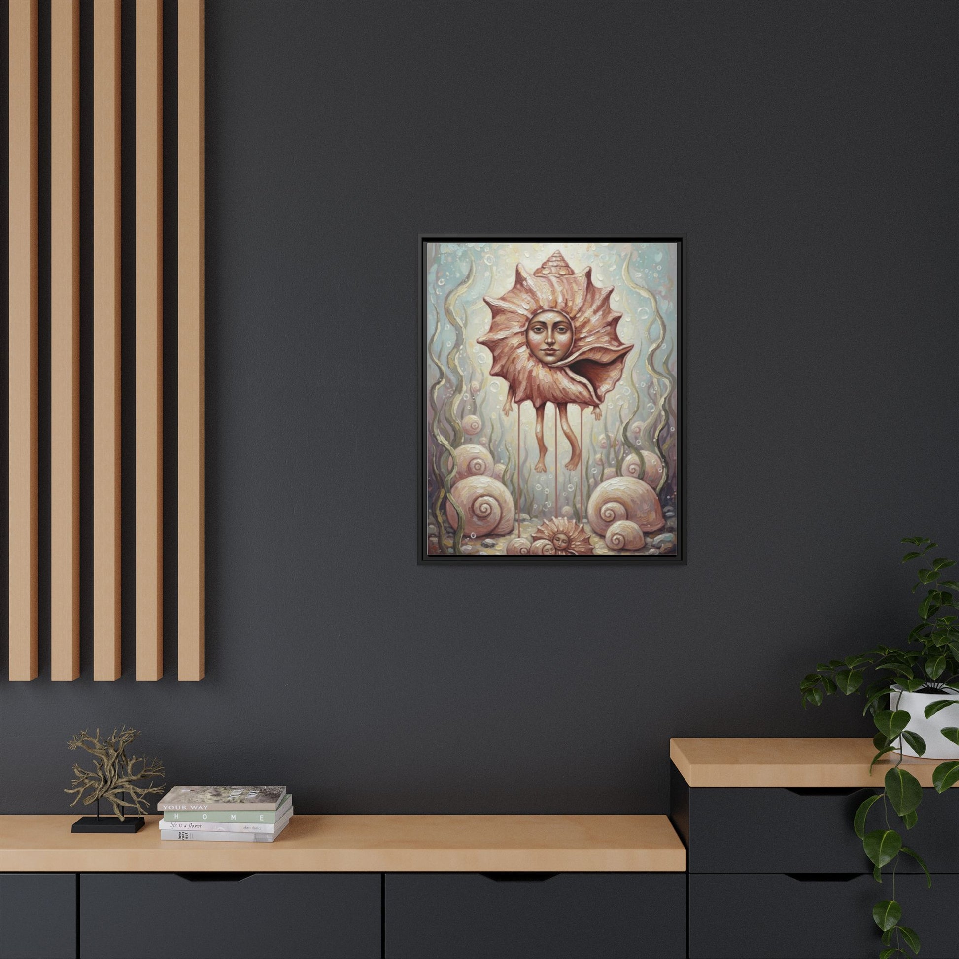This framed matte canvas brings a dreamlike ocean reverie into your space. The soft, muted palette and fluid brushwork create a quiet, contemplative scene—floating shells and a gentle, otherworldly face that feels like a memory of tide and moon. Mounted on a slim pine frame with a refined matte finish, the print sits close to the wall for an elegant, gallery-like presence. It calms a reading nook, anchors a bedroom wall, or lends a subtle, mystical note to a collected living room. Natural texture from the cotton-poly canvas gives depth to every brushstroke while archival, low-VOC inks keep colors true without glare. Comes ready to hang so the moment settles in as soon as it arrives.