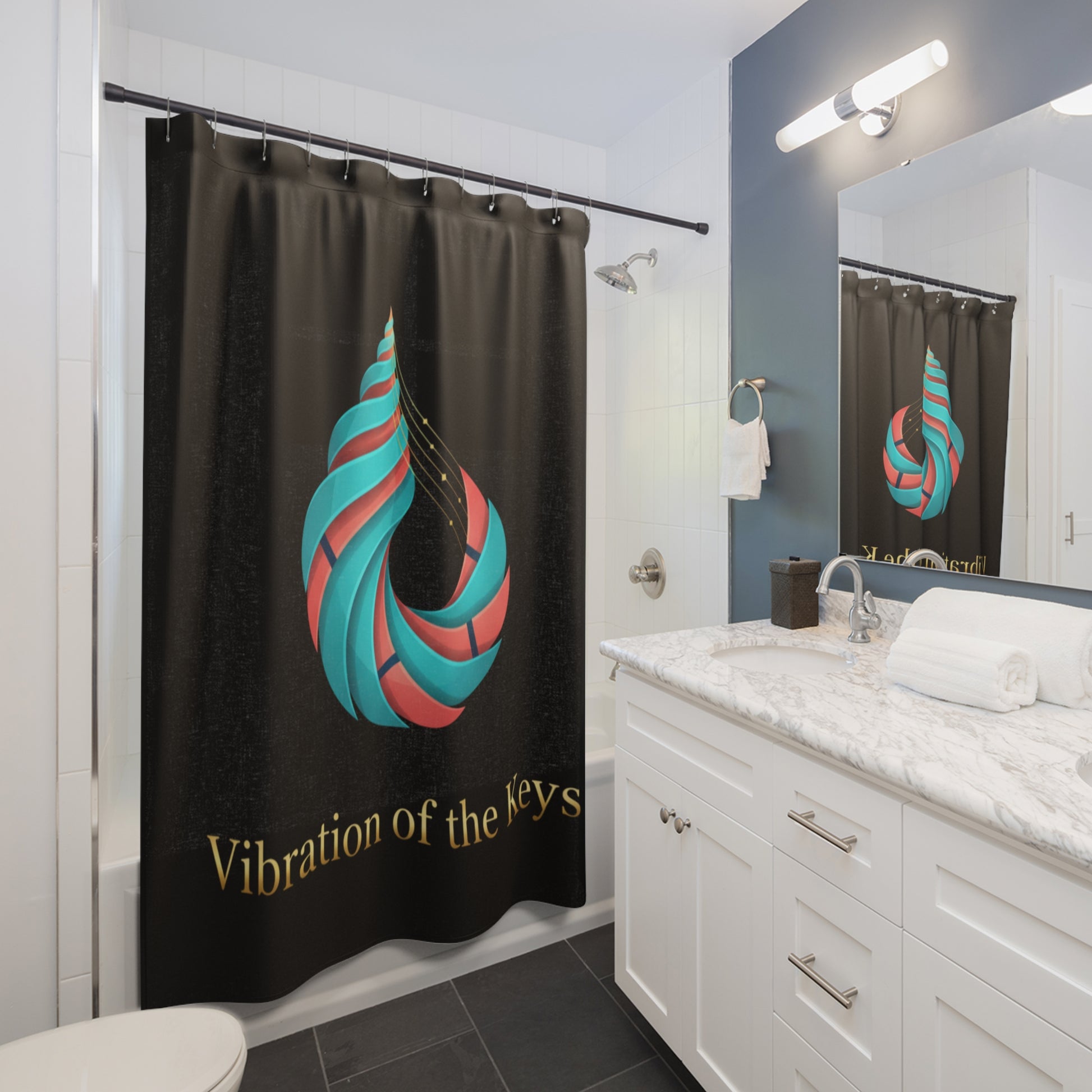 Turn your bathroom into a calm, meditative corner with this sculptural shower curtain. The rich black backdrop makes the teal-and-coral spiral seem to glow, while the tiny golden notes trailing off the form whisper of music and motion. Hang it where you begin and end your day — it slows the pace, invites a mindful moment, and brings a touch of gallery-style design to a daily routine.