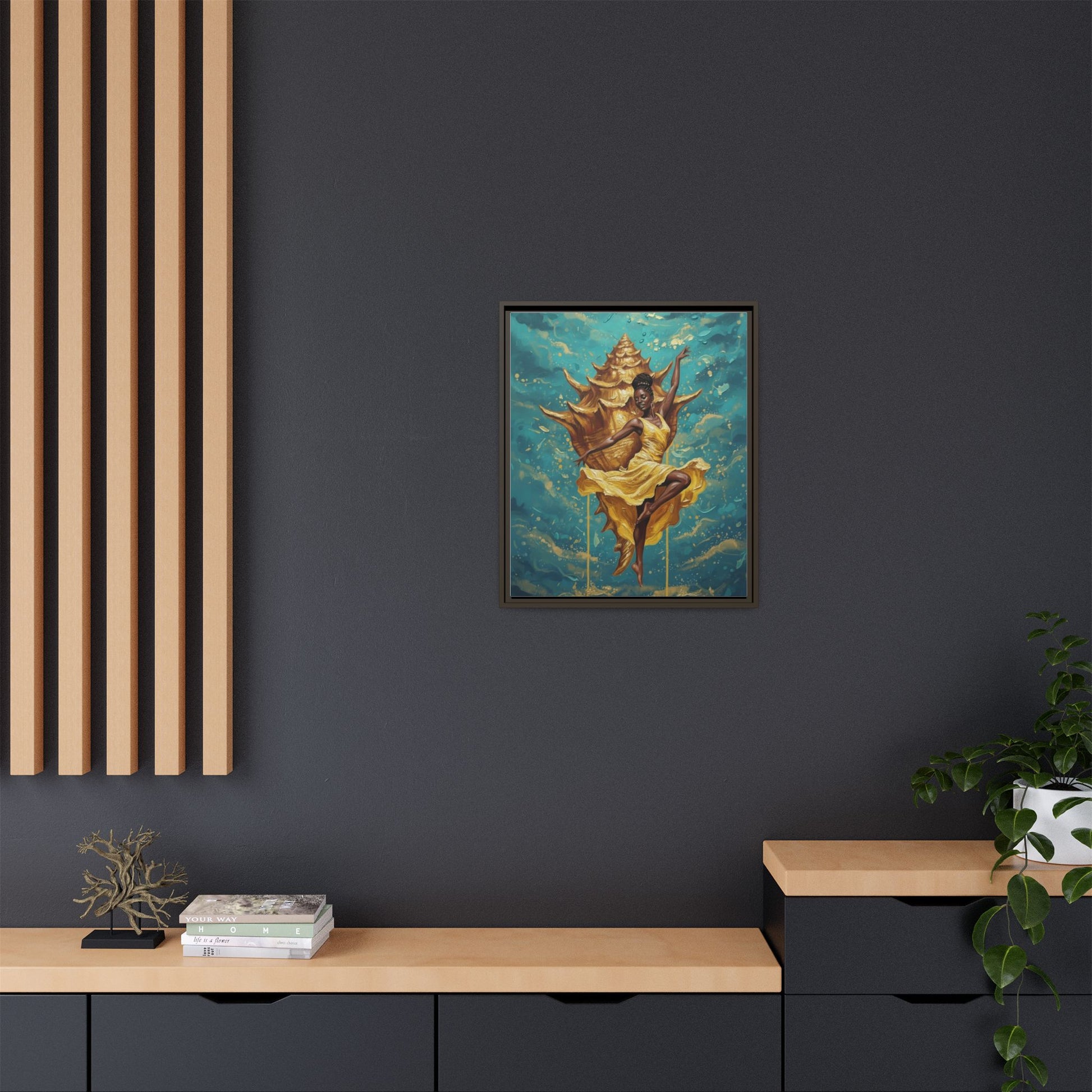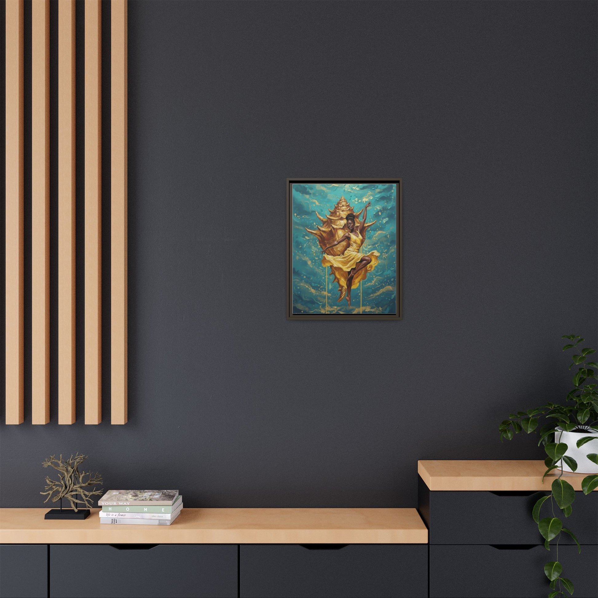 A framed matte canvas that brings rich, gallery-quality color and texture into a room. The deep black frame and matte finish reduce glare while letting the artwork’s teal and gold tones breathe. Lightweight but sturdy, it arrives ready to hang with sawtooth hardware and feels at home above a mantel, in a hallway, or as a focal point in a cozy reading nook. The printed surface uses non-toxic latex inks and a proprietary cotton-polyester coating to keep brushstrokes and fine details vivid for years. Sustainably sourced pine stretcher bars and Greenguard Gold-certified ink mean the piece looks luxurious while meeting higher environmental and safety standards.