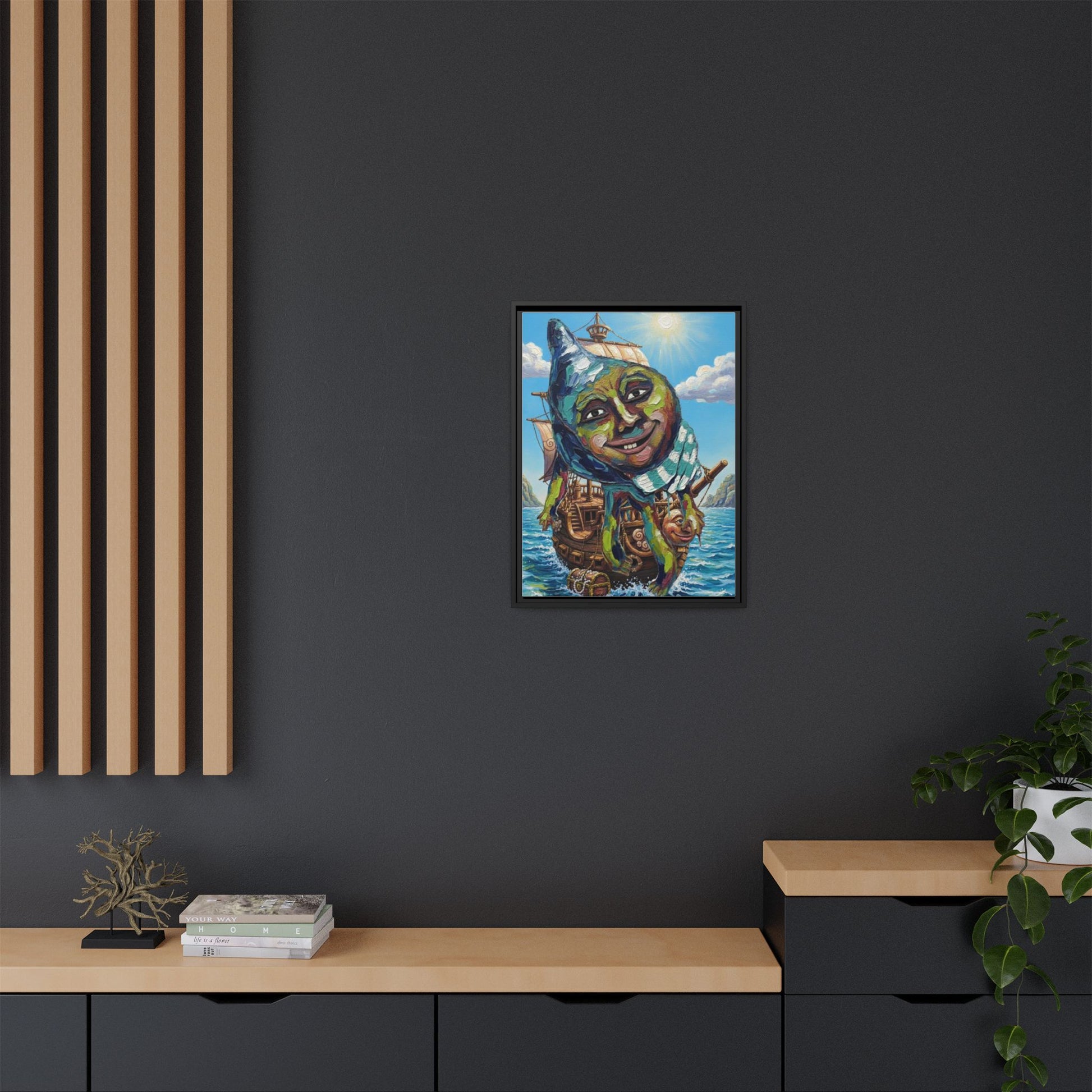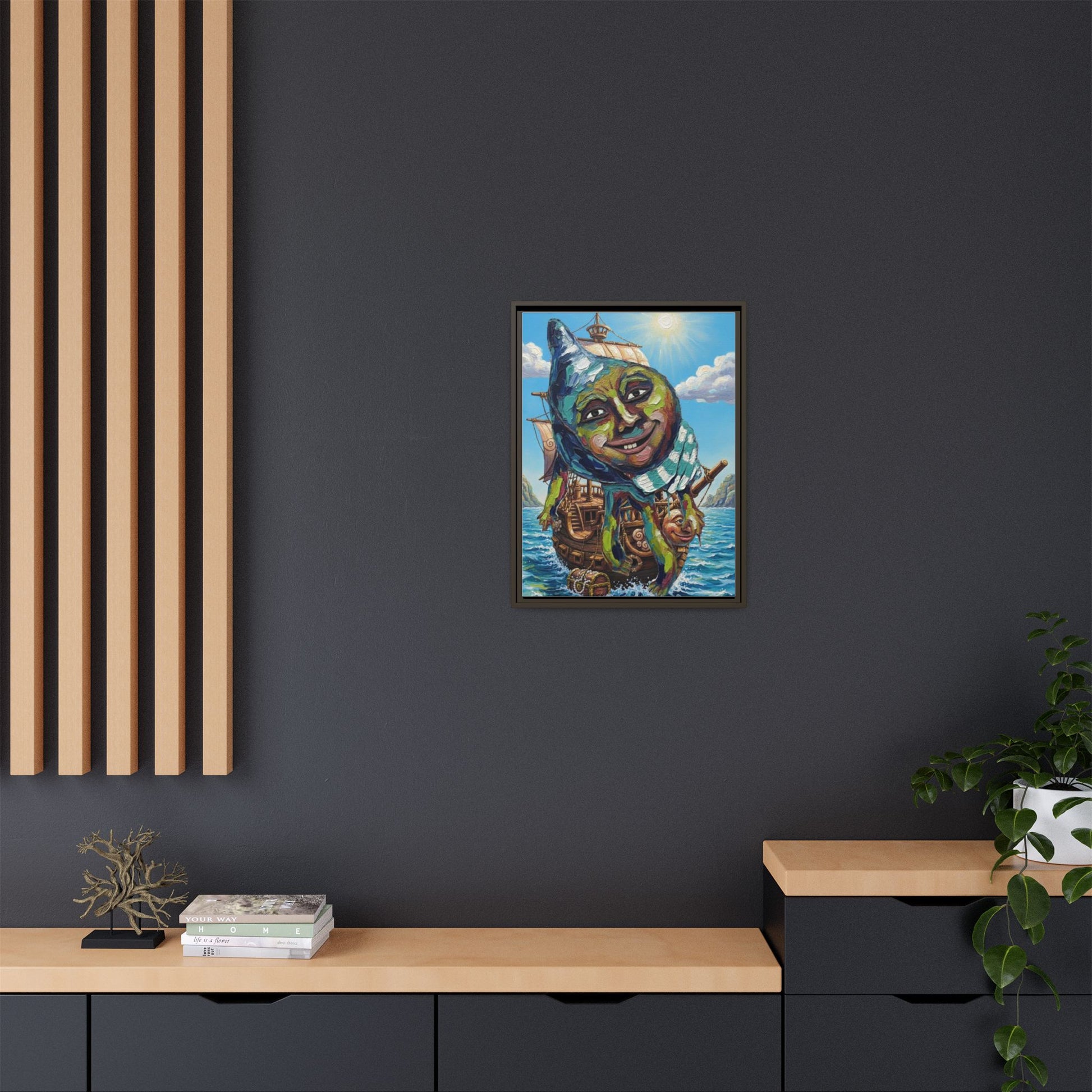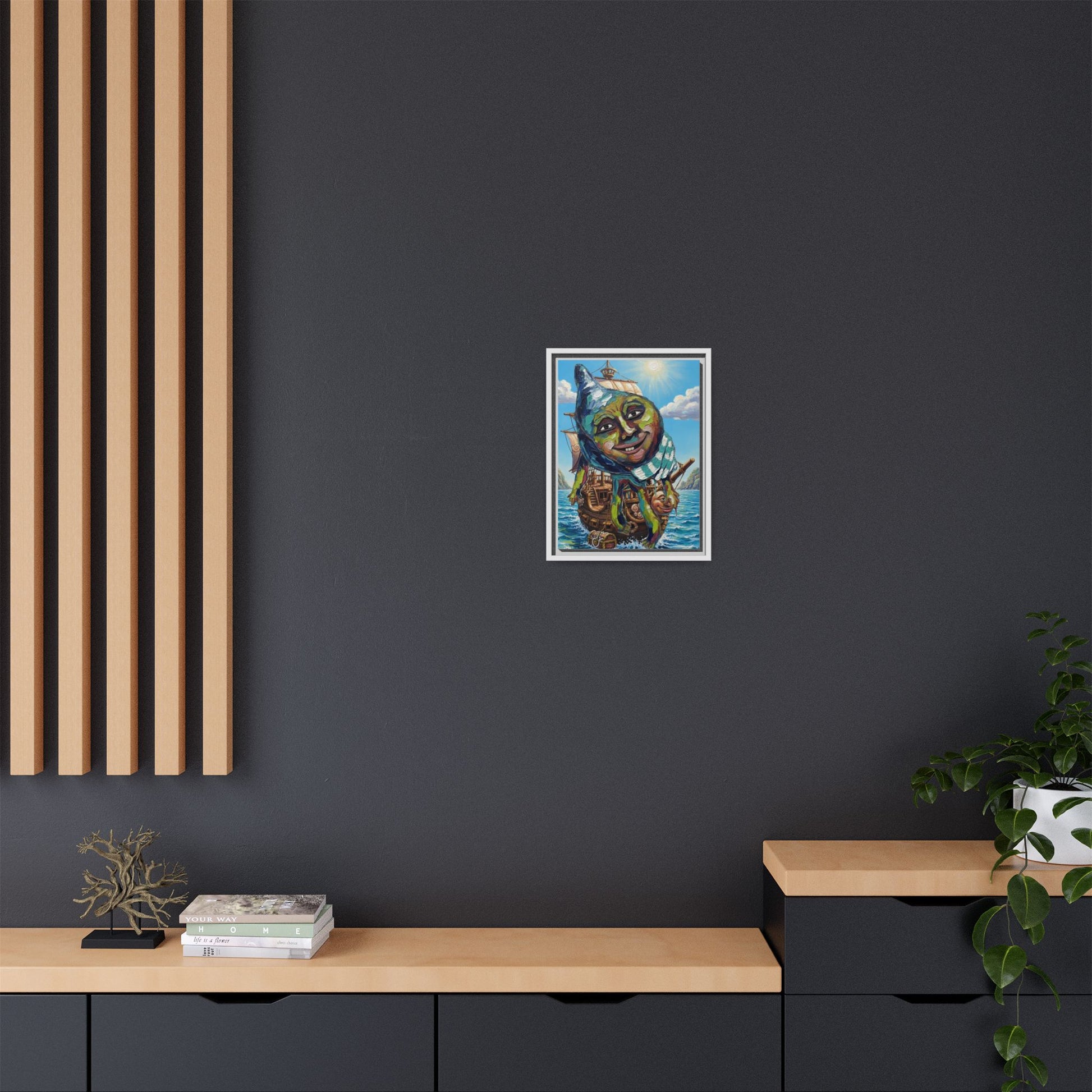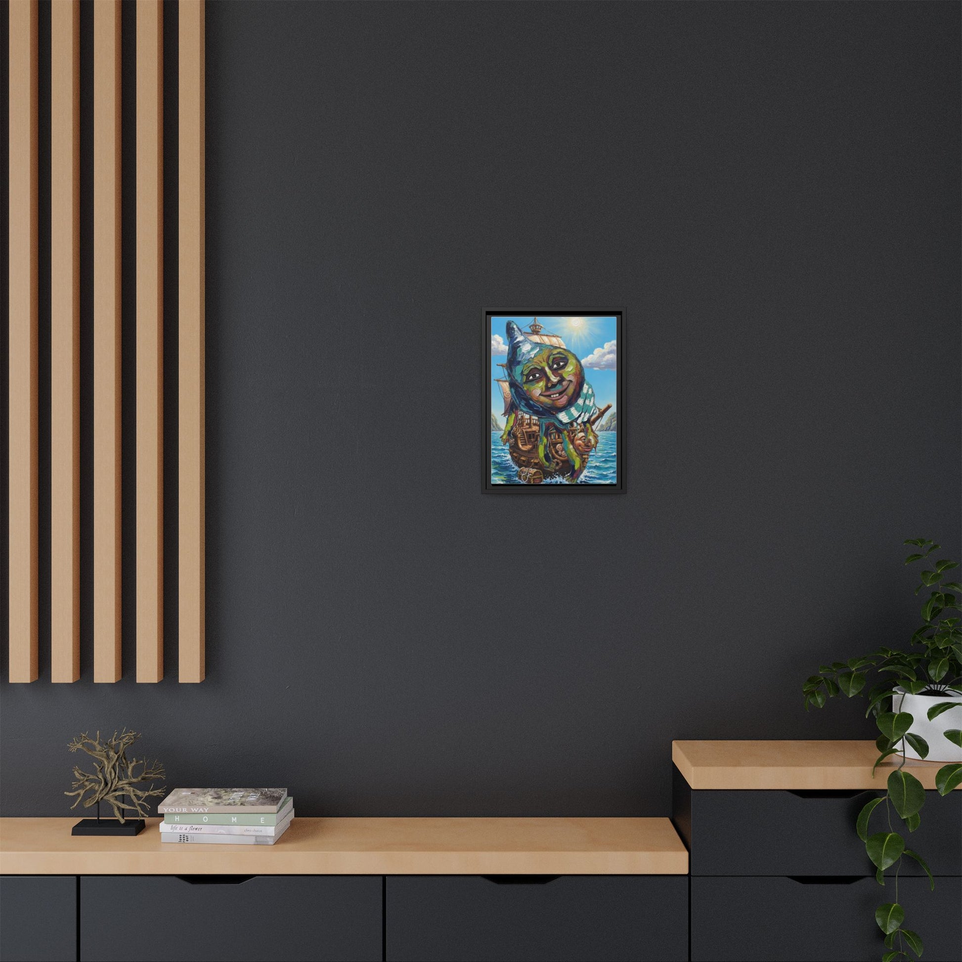 This framed matte canvas brings a playful, dreamlike scene into your room — a whimsical ship adrift beneath a smiling, comch face and a bright sunlit sky. The textured canvas surface gives depth to the painterly brushstrokes while the slim pine frame adds a clean, modern edge. Hung in a study, hallway, or creative nook, the piece invites lingering looks and quiet smiles. The rich, UV-stable inks keep colors lively over time, and the lightweight yet sturdy construction makes installation effortless with included sawtooth hardware.