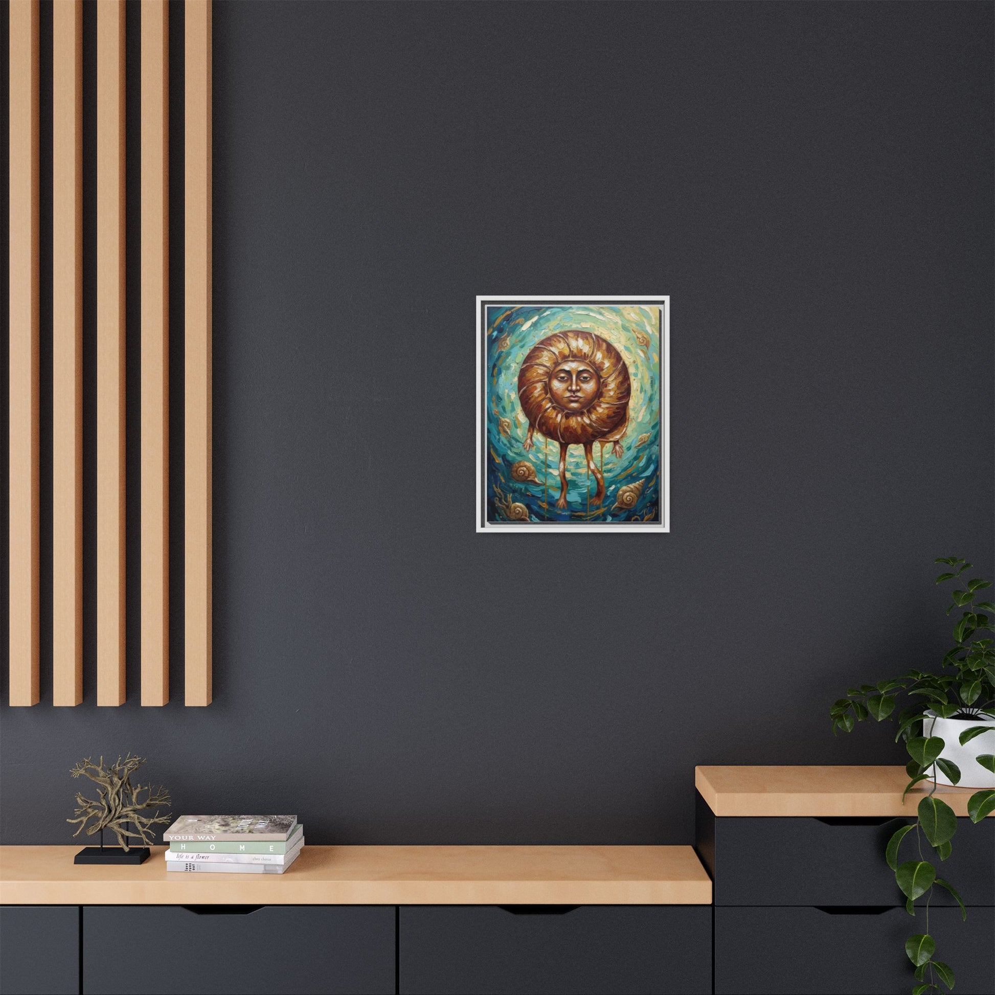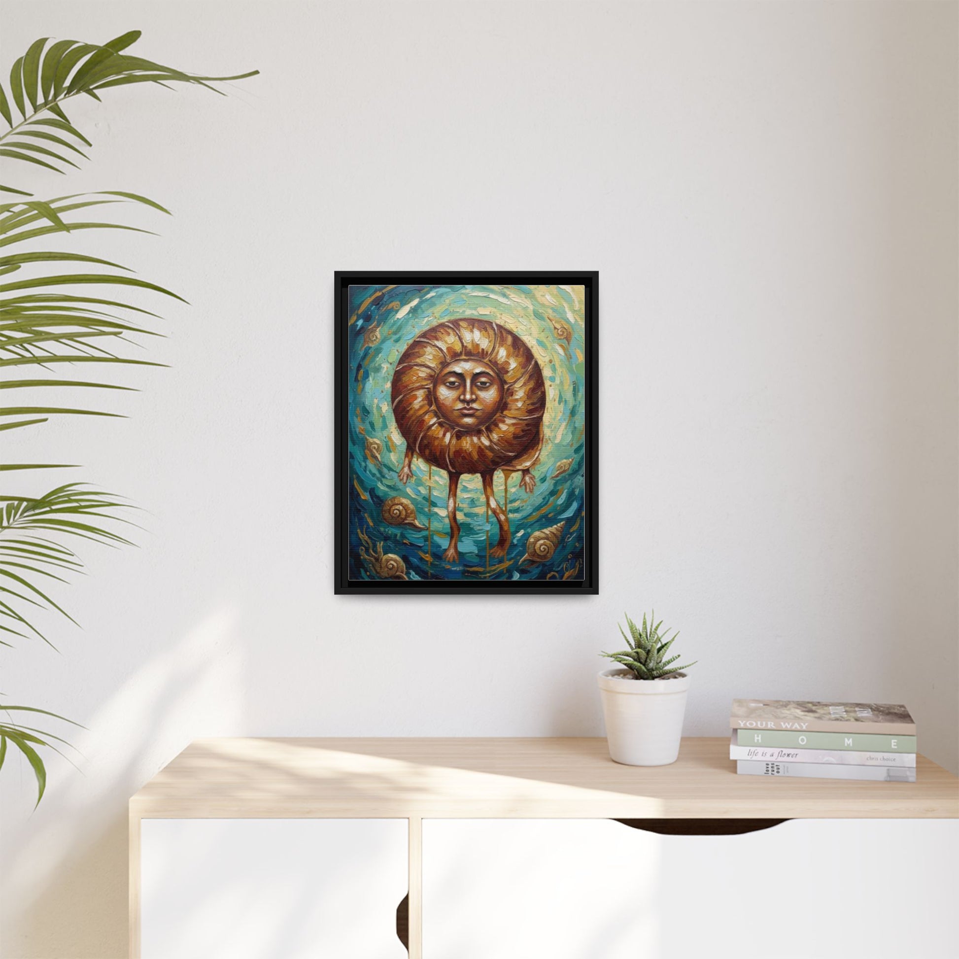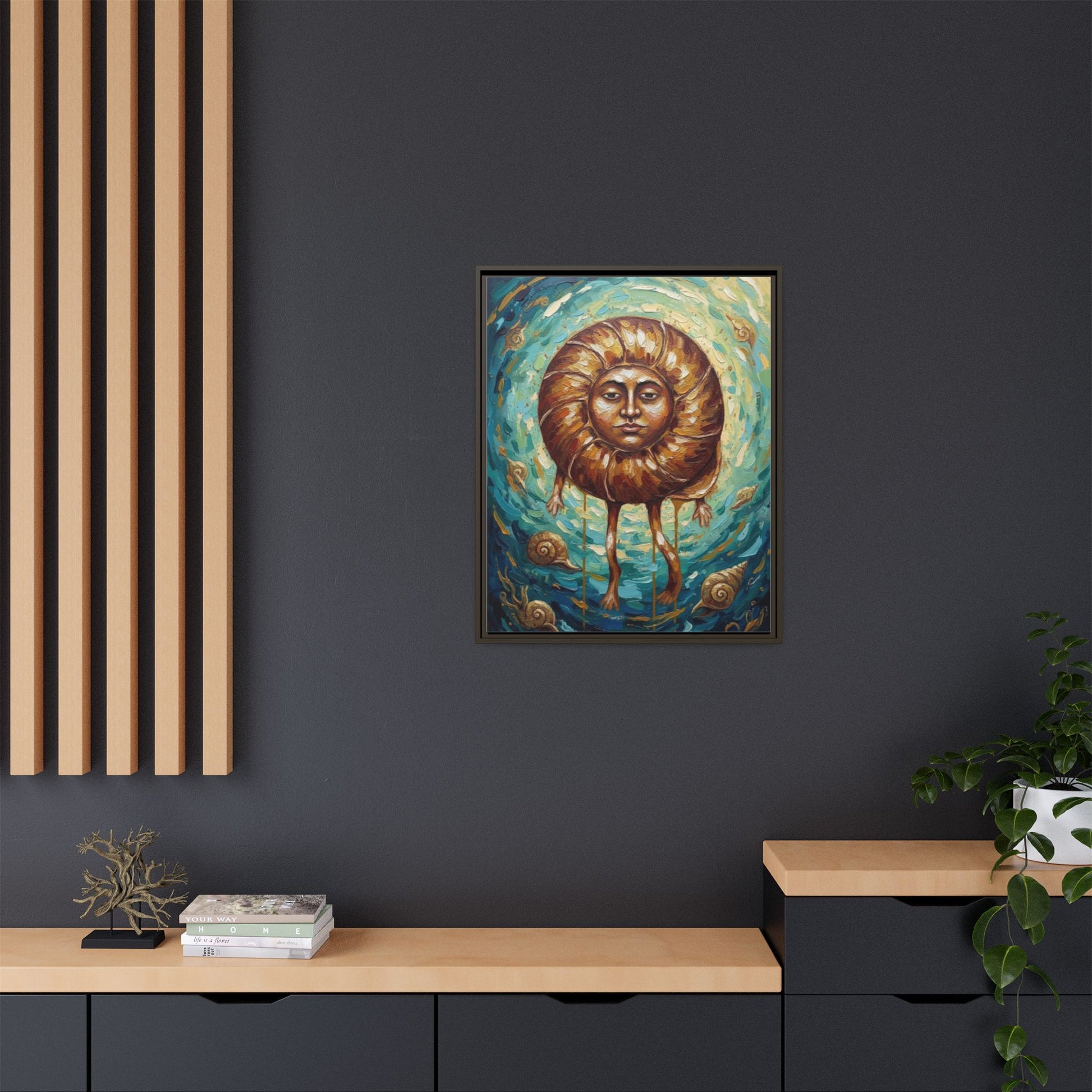 This framed matte canvas brings a surreal, contemplative presence into a room. Rich teal and gold brushstrokes swirl around a central, human-faced nautilus — a little unsettling and deeply expressive. It hangs like a quiet storyteller, turning a living room wall into a place for odd conversations, slow afternoons, and reflective nights. The solid black pine frame gives the piece a grounded, gallery-ready feel while the matte finish softens glare and intensifies the painted textures. For those who collect the uncanny or want a focal artwork that invites lingering, this canvas feels like a personal myth made visible.