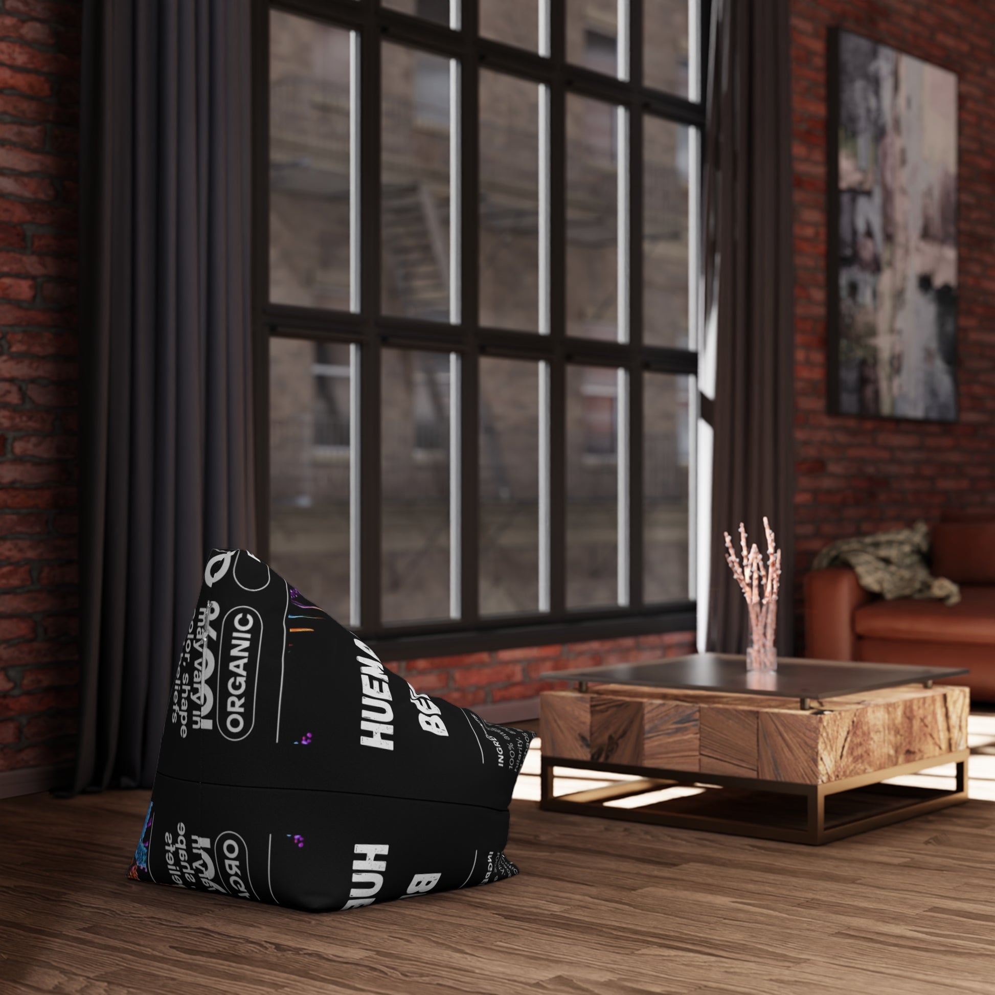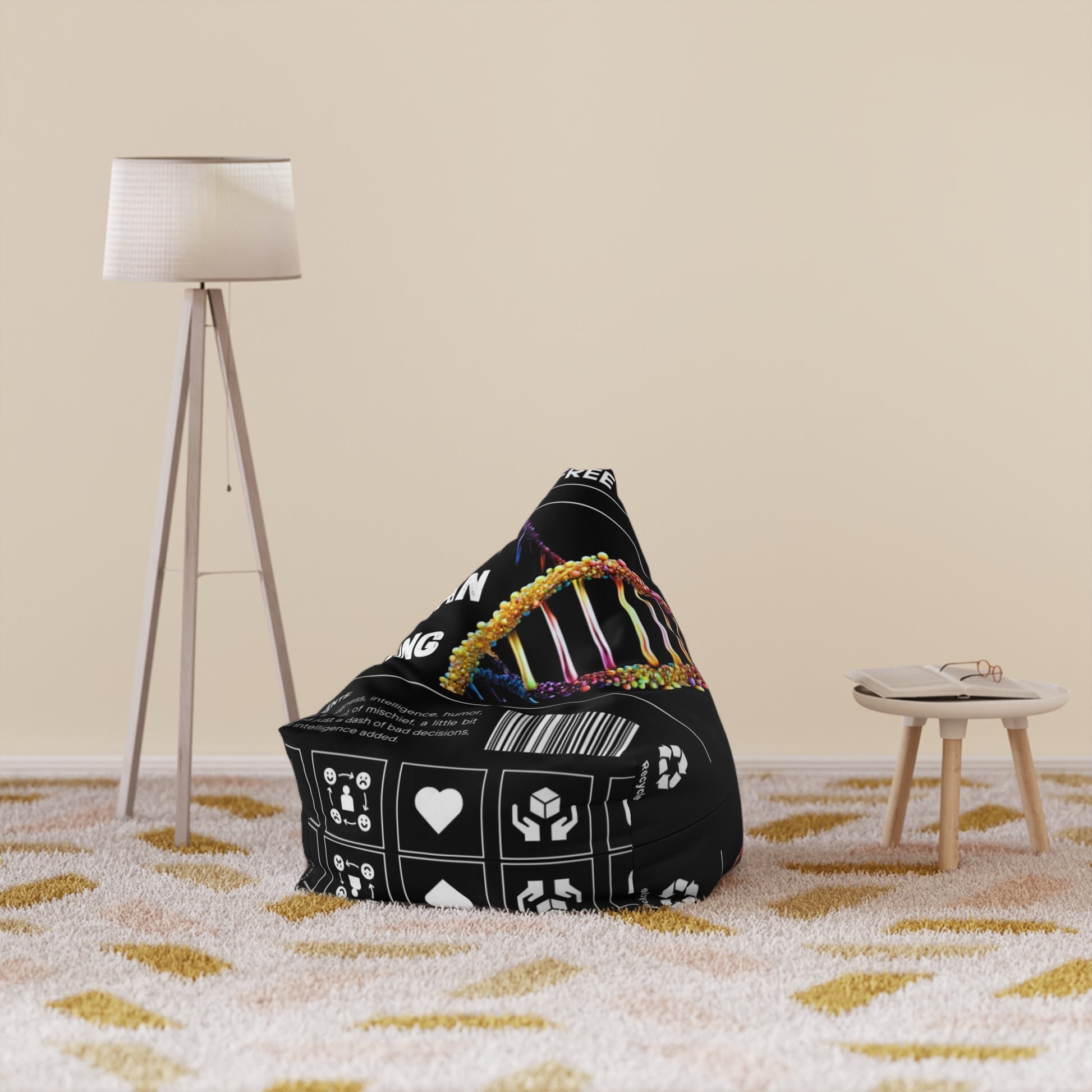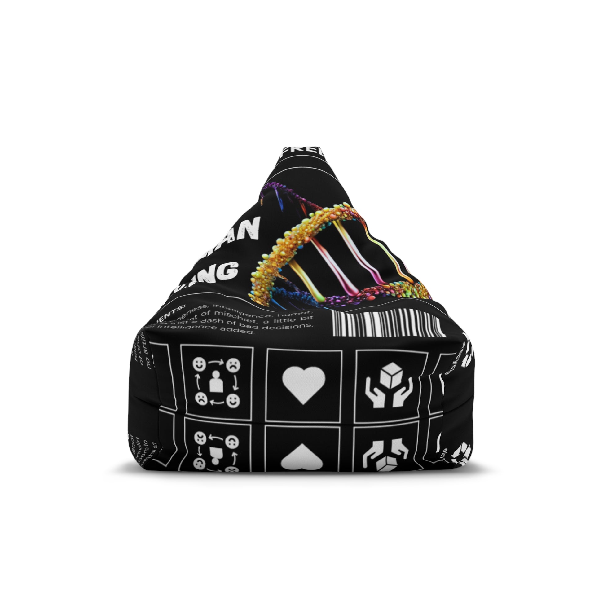 Sink into a sculpted, colorful statement piece that feels like a little thinking nook. This bean bag cover wears a bold, black background printed with bright, neon-like graphics and clear icon panels — a modern, slightly techy look that reads like a curated poster stretched over soft form. The sturdy polyester canvas holds its shape while the hidden locking zipper and sewn-in inner case keep beads contained and tidy. Choose small for compact corners and cozy reading forts, or go big to shape a lounging anchor in a living room or studio. It ships empty so you can fill to your preferred firmness and create the exact sink-and-support you want.