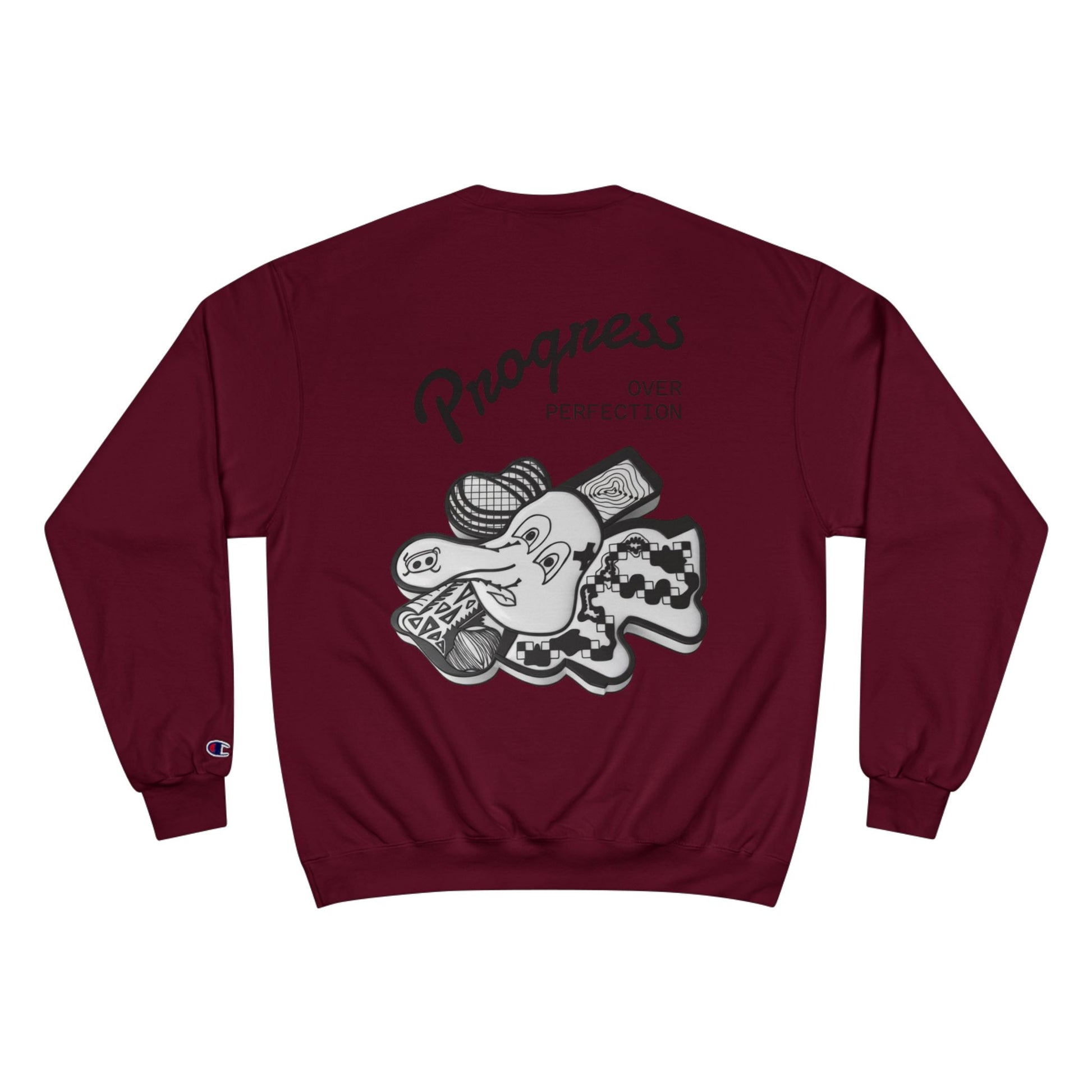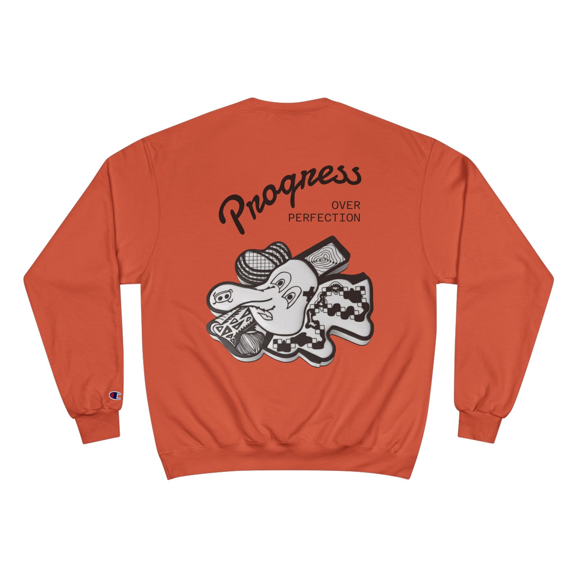 A comfy, mid-weight sweatshirt that blends vintage skate-culture graphics with a clean, modern front logo. The front keeps things minimal with a subtle typographic mark, while the back bursts into character with a playful, hand-drawn mascot and the phrase “Progress Over Perfection.” Wear it when you want warmth without shouting — it reads like a personal statement: relaxed confidence, a streak of humor, and an appreciation for steady improvement. The soft cotton-poly fabric has enough heft to hold print well and the tubular knit construction gives a smooth, seam-free look. Cuffed sleeves and a ribbed hem keep the shape through repeated wear, and the small “C” sleeve badge nods to classic athletic styling. This is for people who show up, skate, create, and prefer authenticity over polish.
