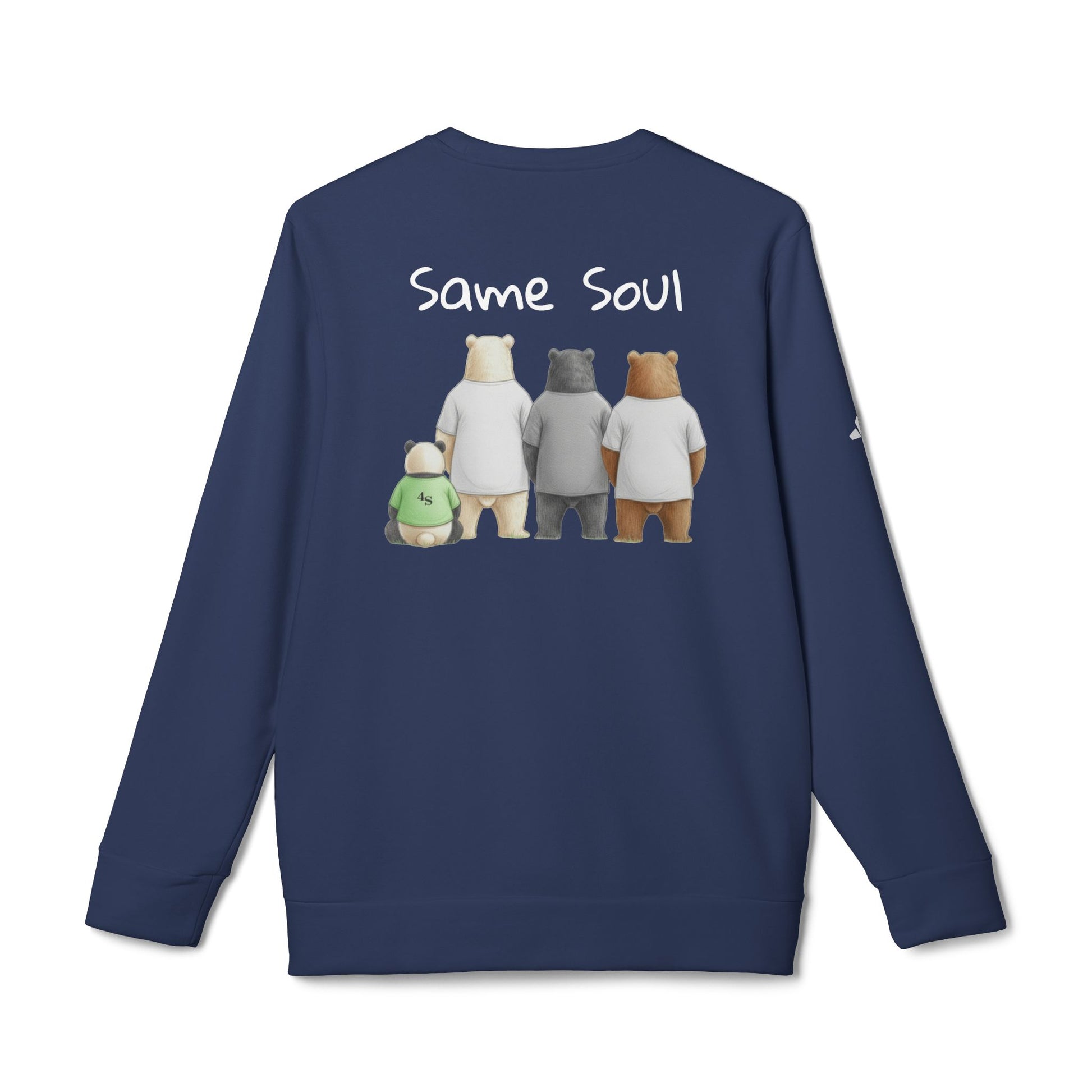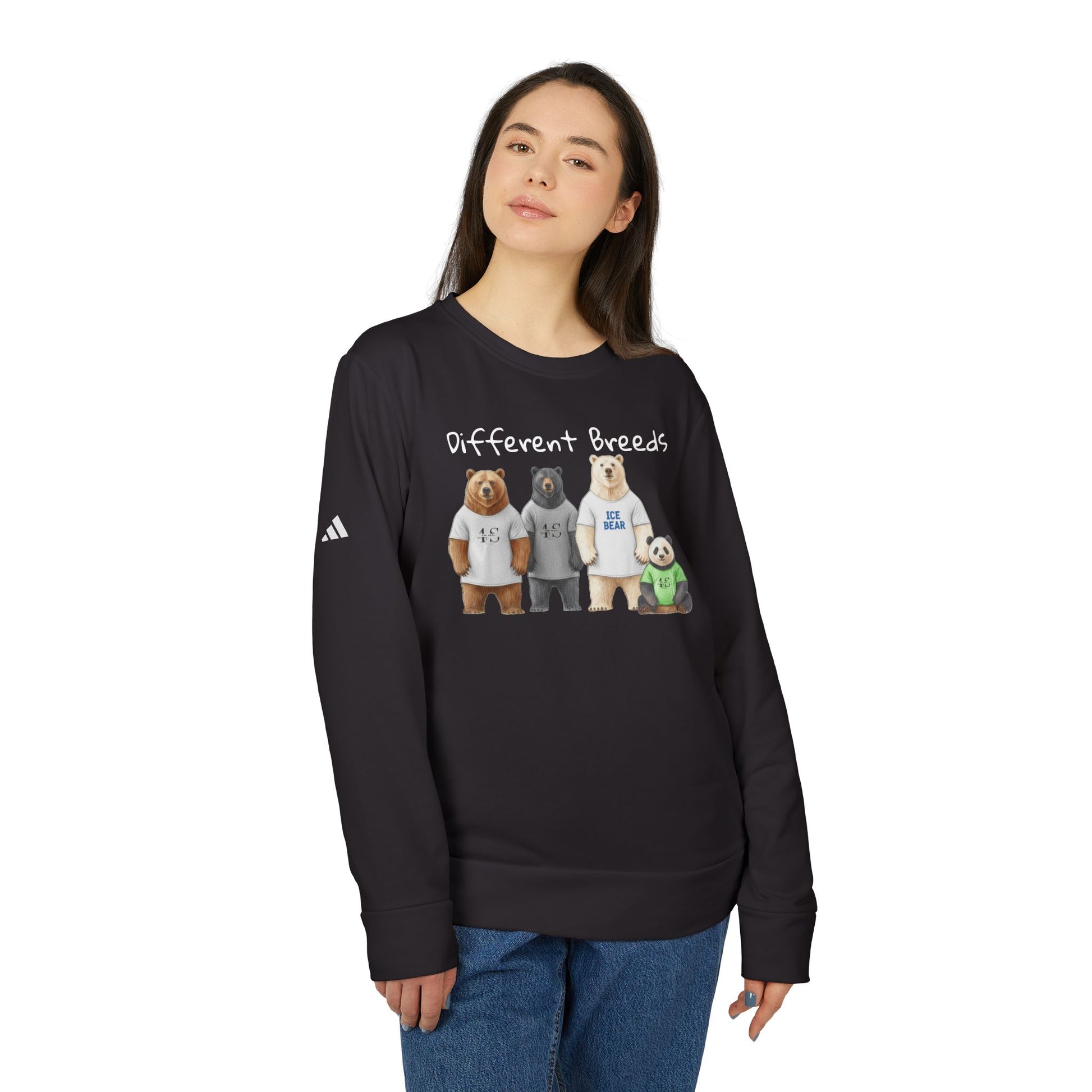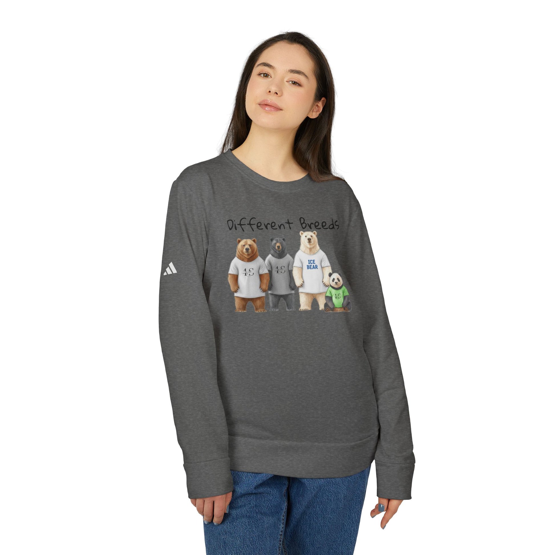 A cozy crewneck sweatshirt that brings a quiet, playful warmth to everyday wear. Soft, medium-heavy fabric drapes comfortably while cuffed sleeves and a fitted hem keep the silhouette neat. The front shows a row of friendly bears under the words “Different Breeds,” and the back carries the same characters from behind with the caption “Same Soul,” a gentle reminder that appearances change but connection remains. Subtle adidas contrast logo on the sleeve and sewn-in labels add authentic athletic detail. DTF printing keeps the artwork crisp and soft to the touch. Wear it on cool mornings, low-key hangouts, or lazy weekends to feel grounded and connected without trying too hard.