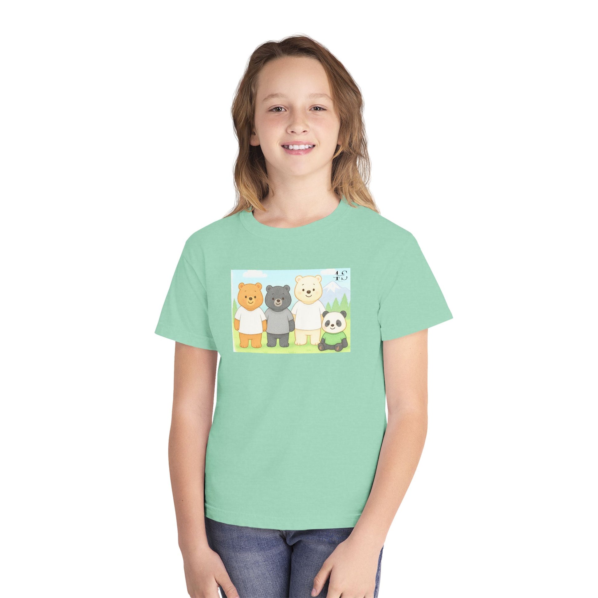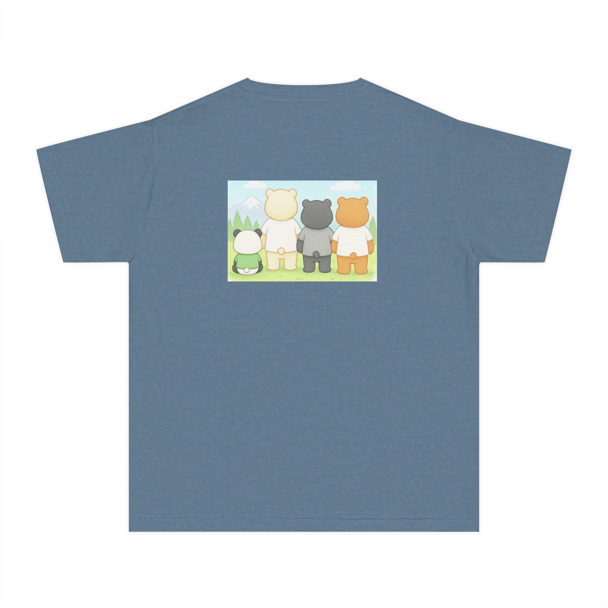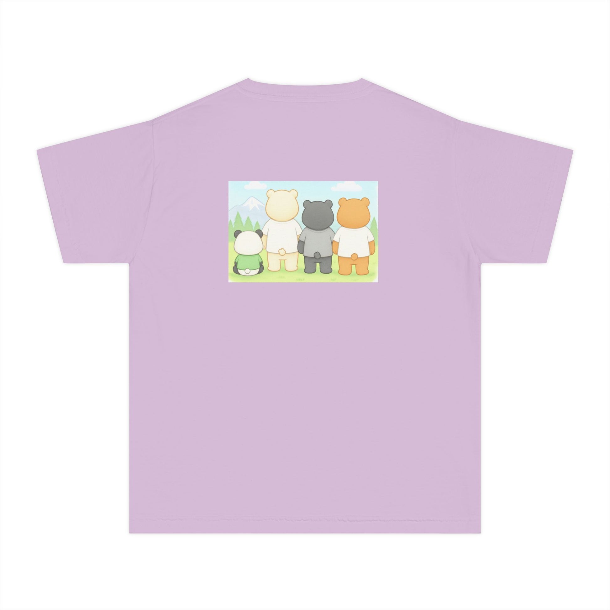 Soft, sunny, and full of gentle charm — this tee brings a small, cozy world to life. Three cuddly bears and a little panda stand together in a pastel meadow, their simple shapes and warm colors creating a calm, friendly scene. The garment-dyed cotton gives the shirt a lived-in softness that matches the illustration’s mellow mood. Lightweight but substantial, it sits comfortably on youthful shoulders and moves easily during play, storytime, or quiet afternoons outside.