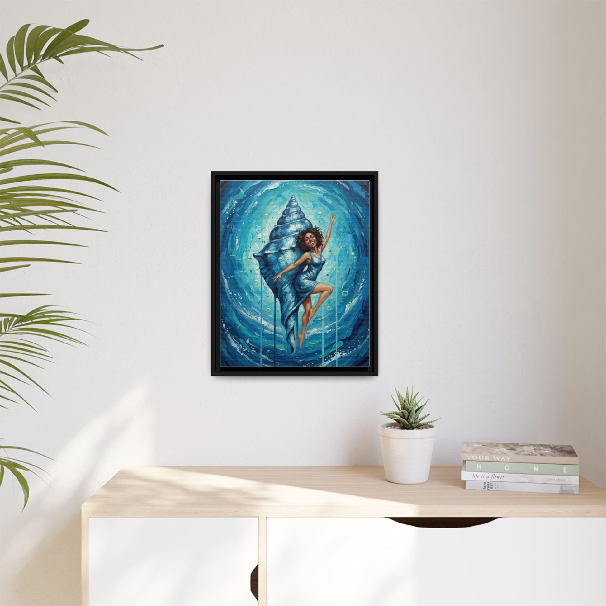 Dive into a pocket of ocean-blue magic with this framed matte canvas. The artwork captures a joyful dancer emerging from a spiraling conch, surrounded by swirling turquoise currents and shimmering bubbles. The matte finish softens glare while preserving bold, saturated blues and fine brush details. Lightweight yet sturdy, the pine frame gives a clean, modern edge and comes ready to hang — it settles into living rooms, home studios, or cozy reading nooks as an uplifting focal point. Hang it to bring a sense of movement, sea-breeze calm, and radiant energy to a space that loves color and story.