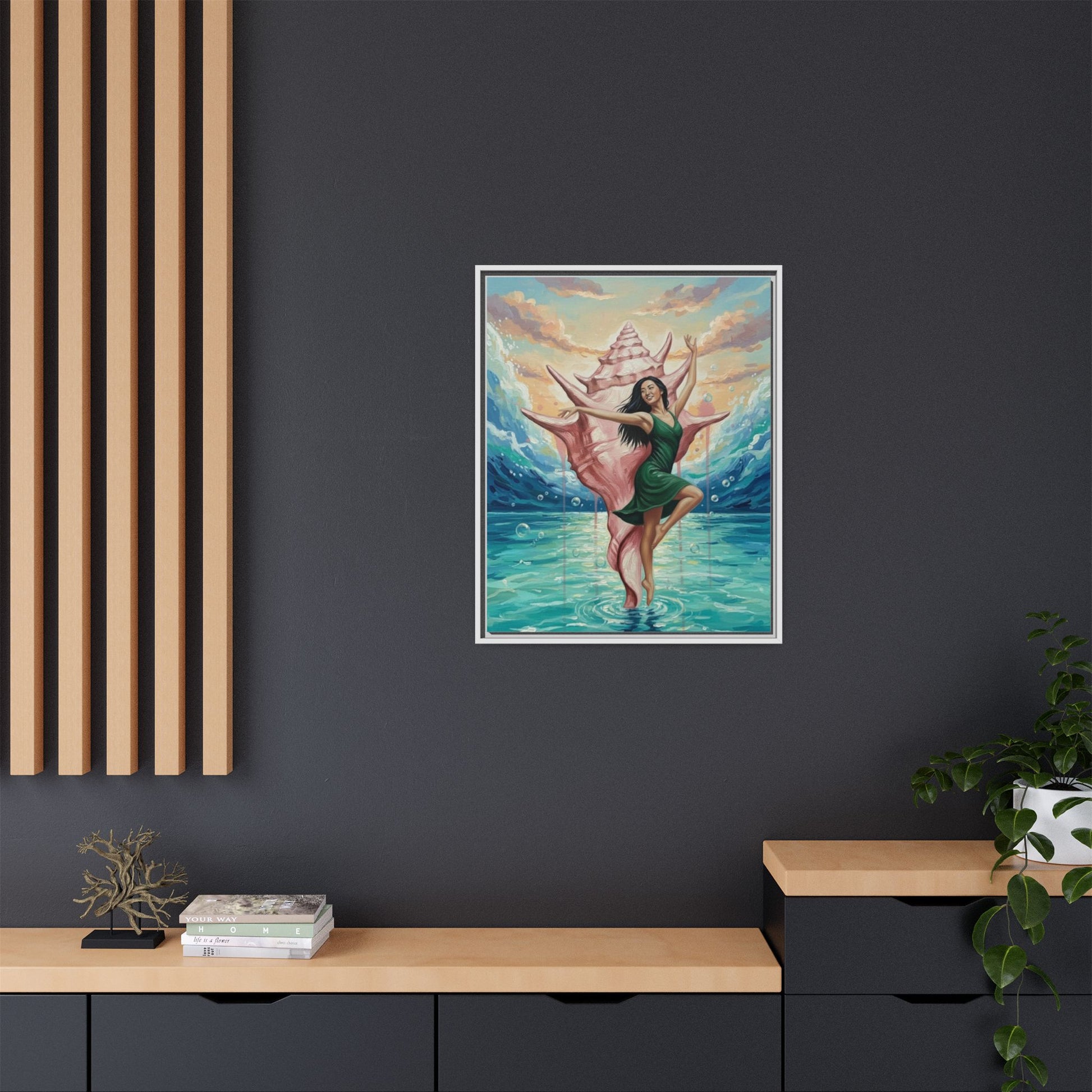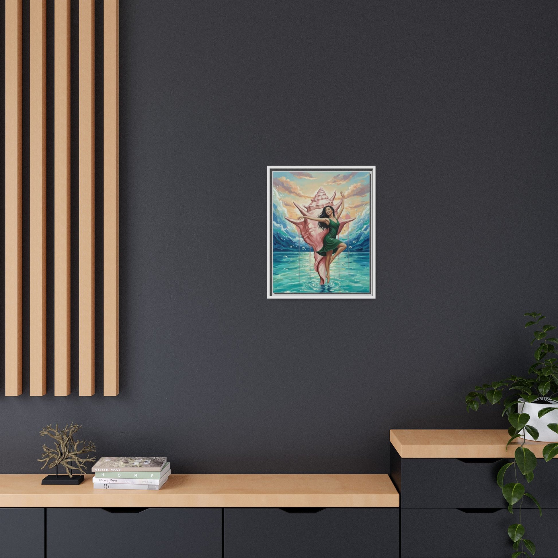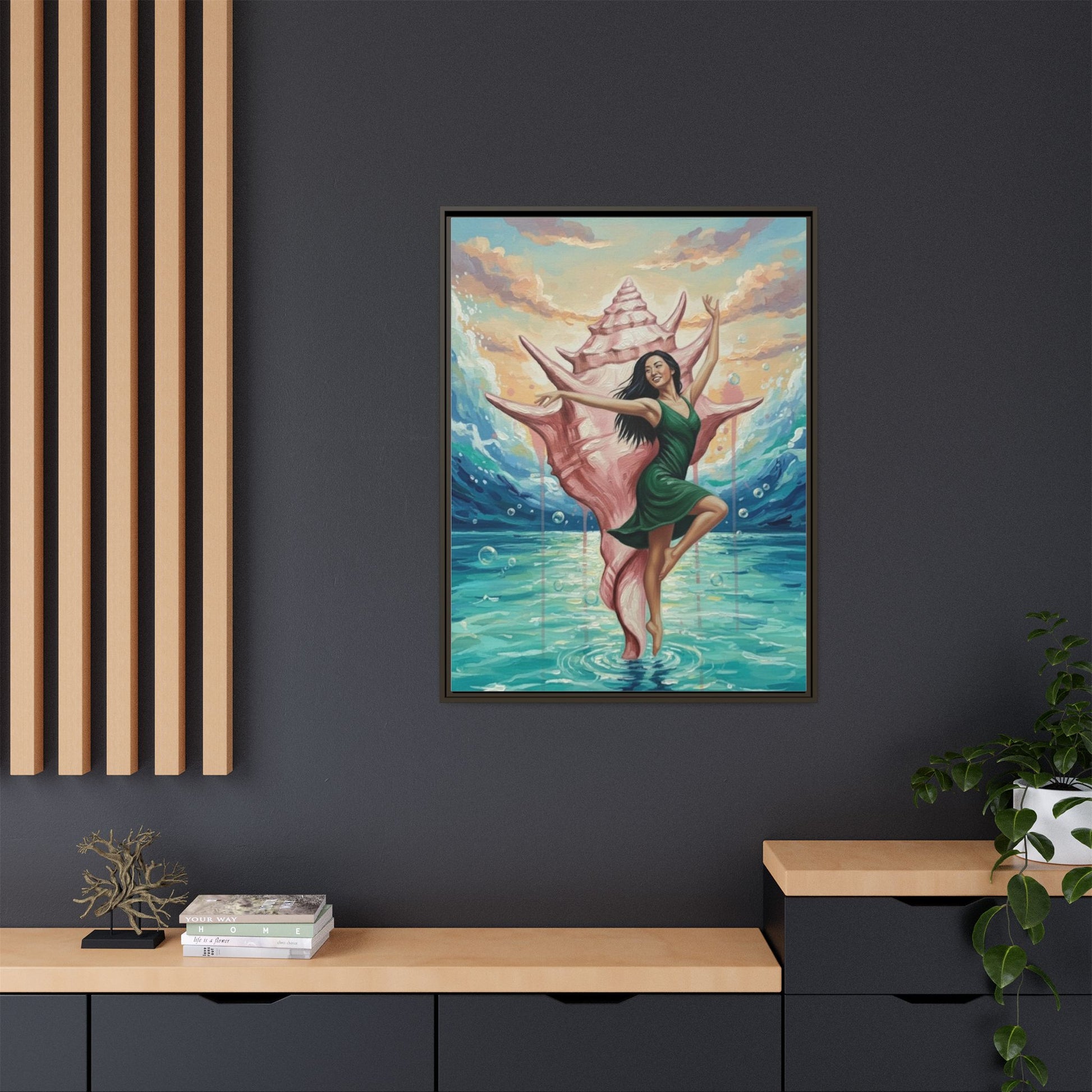 Bring the ocean’s hush and a sense of wonder into any room with this matte canvas print, framed in sleek pine. A dancer emerges from a giant conch, poised above turquoise waters as soft sunset light pours in—an image that feels like a private coastal daydream. The matte surface keeps glare low and colors rich, while the narrow frame adds a modern silhouette that lets the artwork breathe on your wall. Hang it in a living room, studio, or beach cottage to evoke calm tides, creative flow, and the small ceremony of returning to shore after a long day.