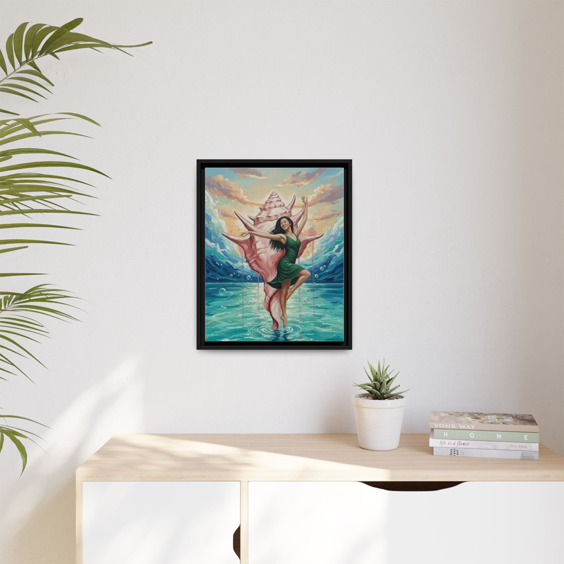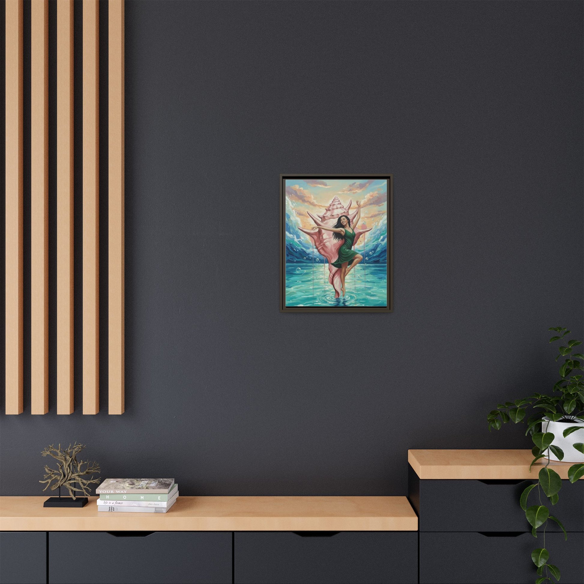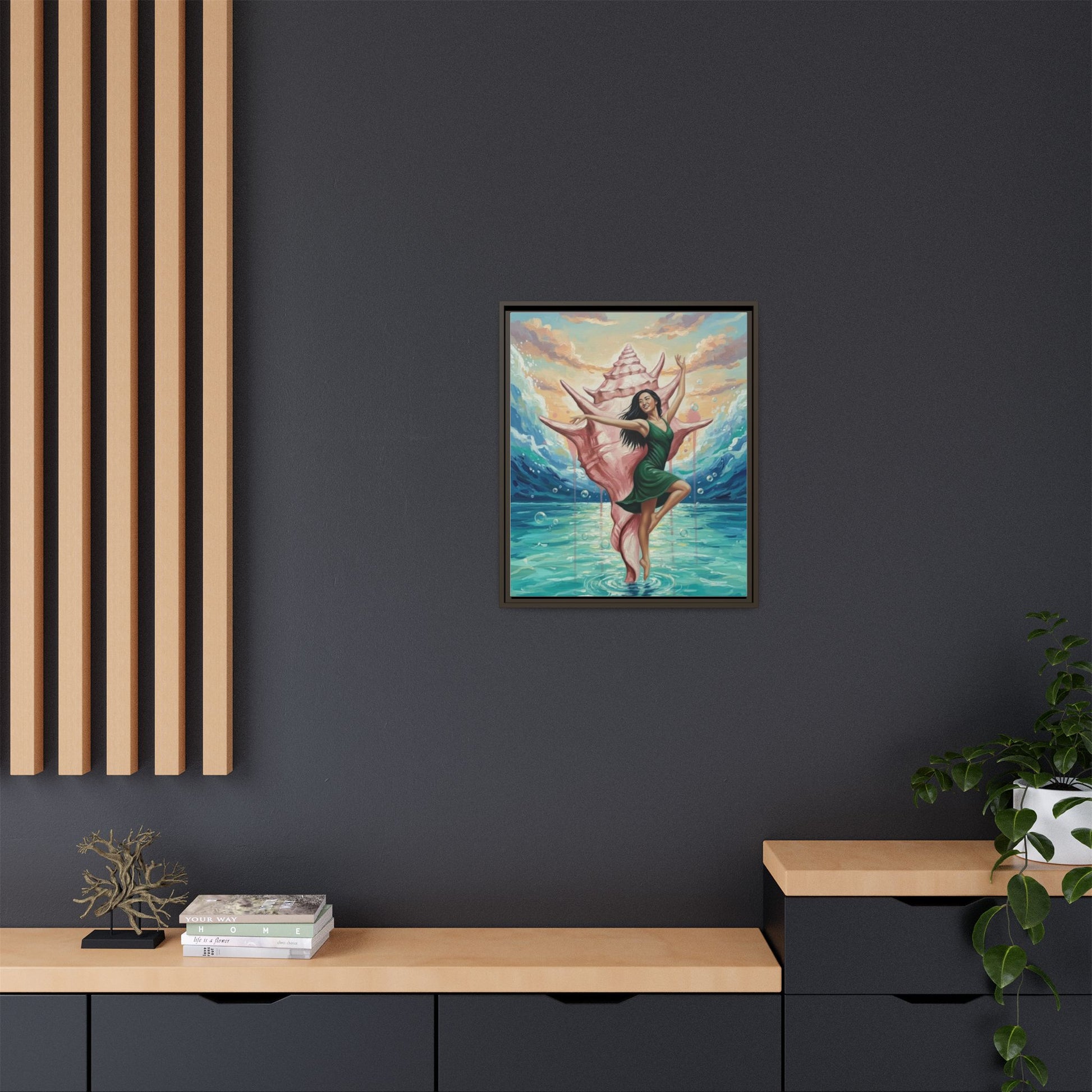 Bring the ocean’s hush and a sense of wonder into any room with this matte canvas print, framed in sleek pine. A dancer emerges from a giant conch, poised above turquoise waters as soft sunset light pours in—an image that feels like a private coastal daydream. The matte surface keeps glare low and colors rich, while the narrow frame adds a modern silhouette that lets the artwork breathe on your wall. Hang it in a living room, studio, or beach cottage to evoke calm tides, creative flow, and the small ceremony of returning to shore after a long day.