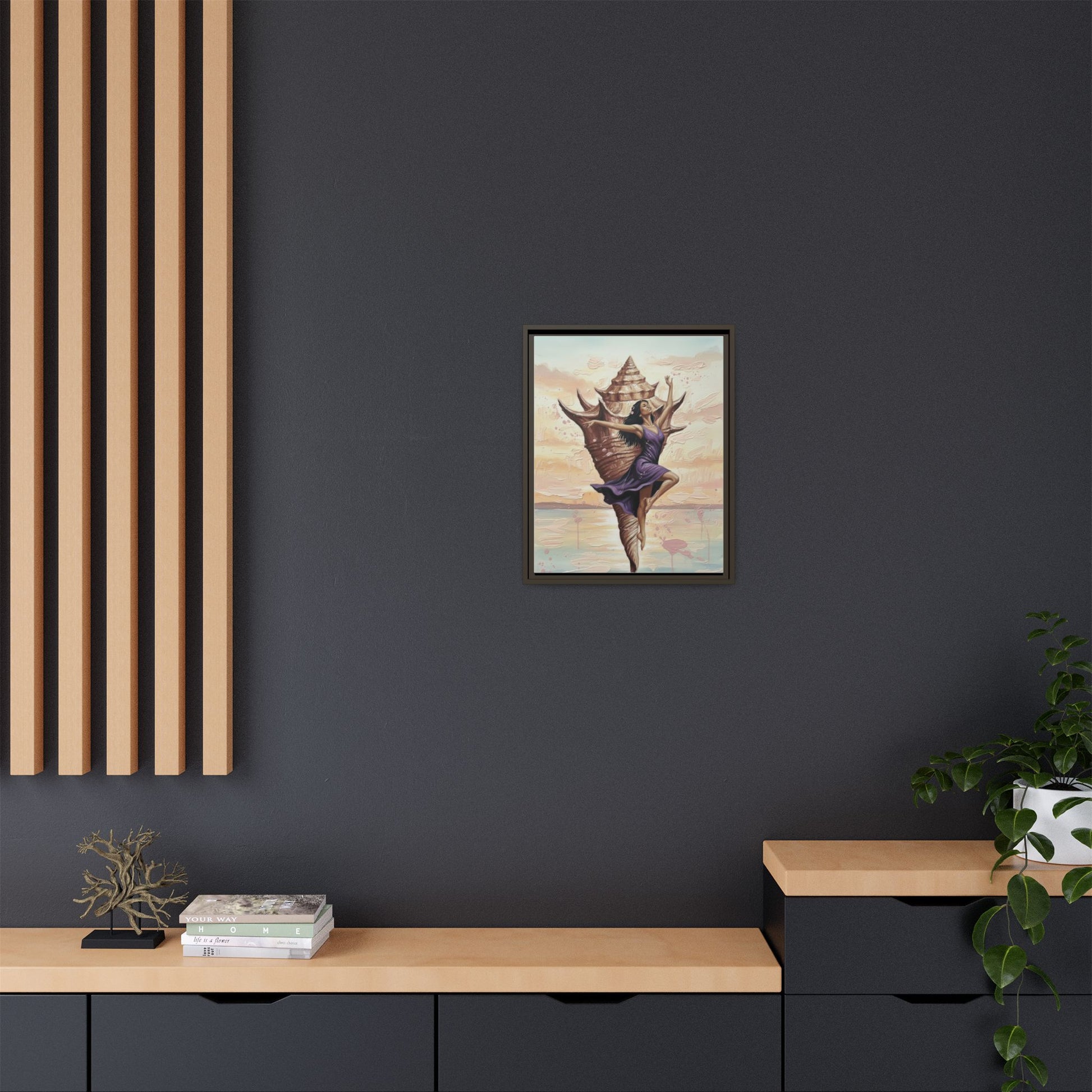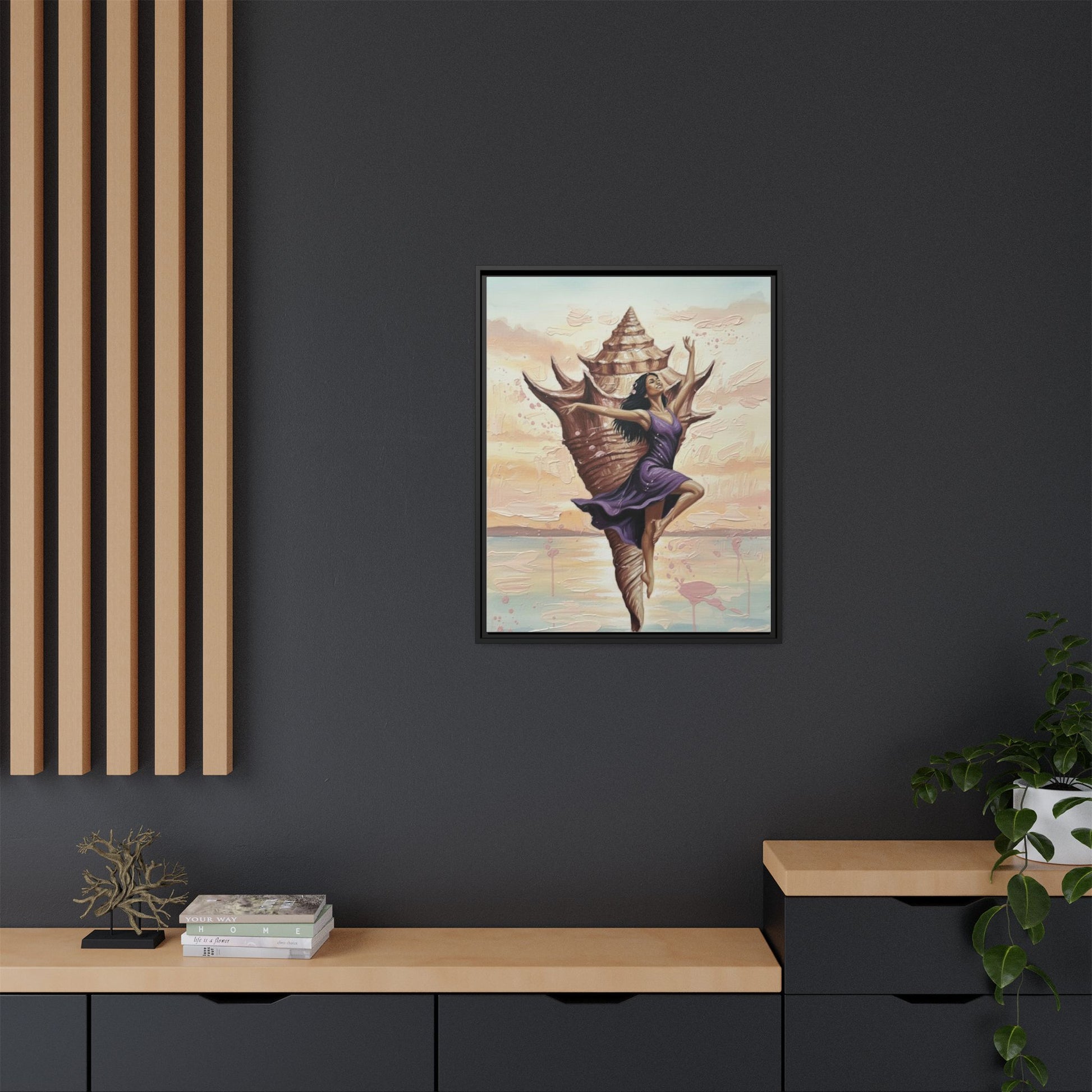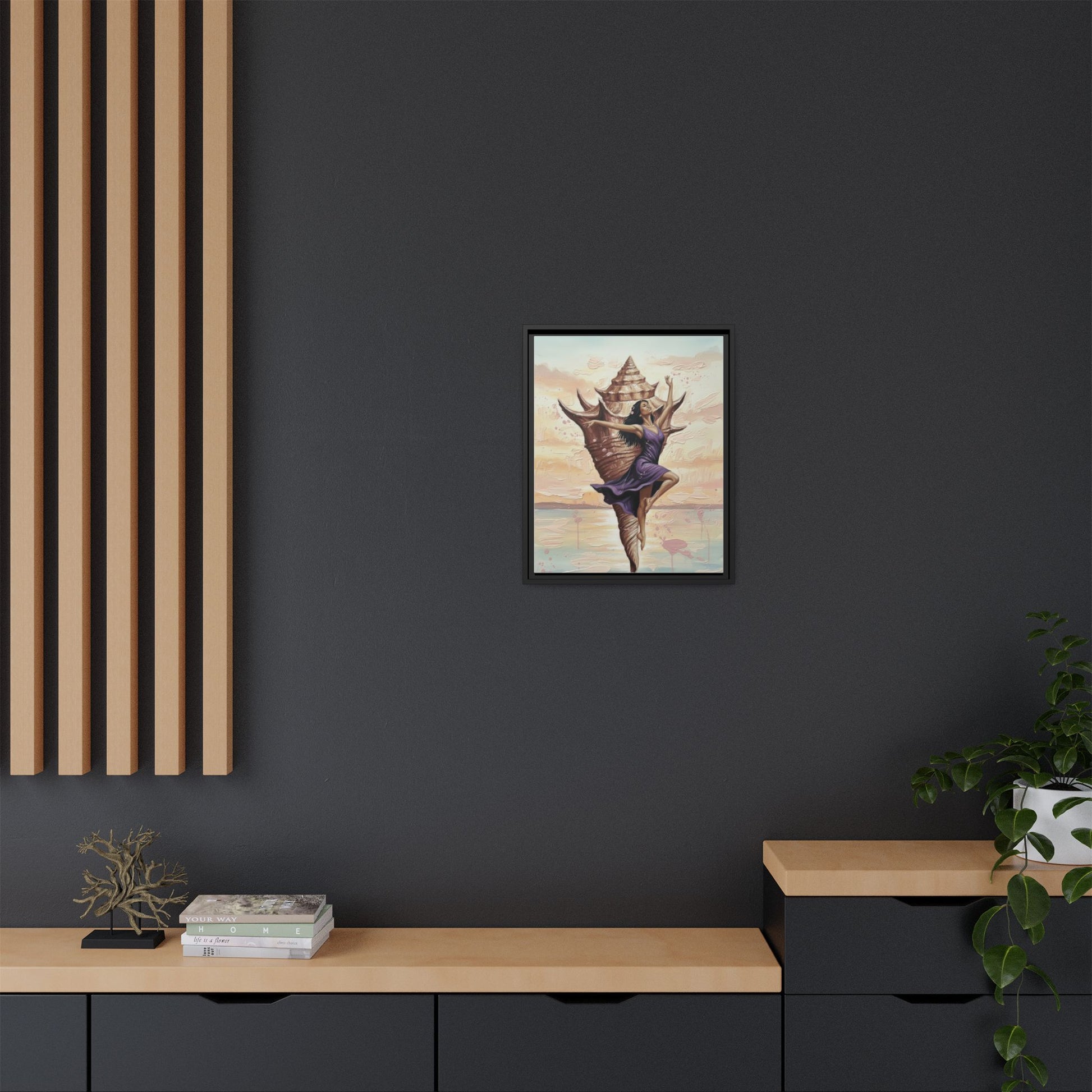 This framed matte canvas brings a quiet, seaside reverie into your space. A figure emerges from a spiraled conch, arms open as if greeting sea-salt air and the slow drift of dawn. Soft pastels and painterly textures give the scene an artful, contemplative energy — it reads like a memory of ocean light and wind, not just an image on a wall. Hung above a reading chair or in a sunlit hallway, the print invites long looks and gentle breaths. The slim black frame and matte surface keep reflections low and colors rich, so the artwork feels intimate and present every day.