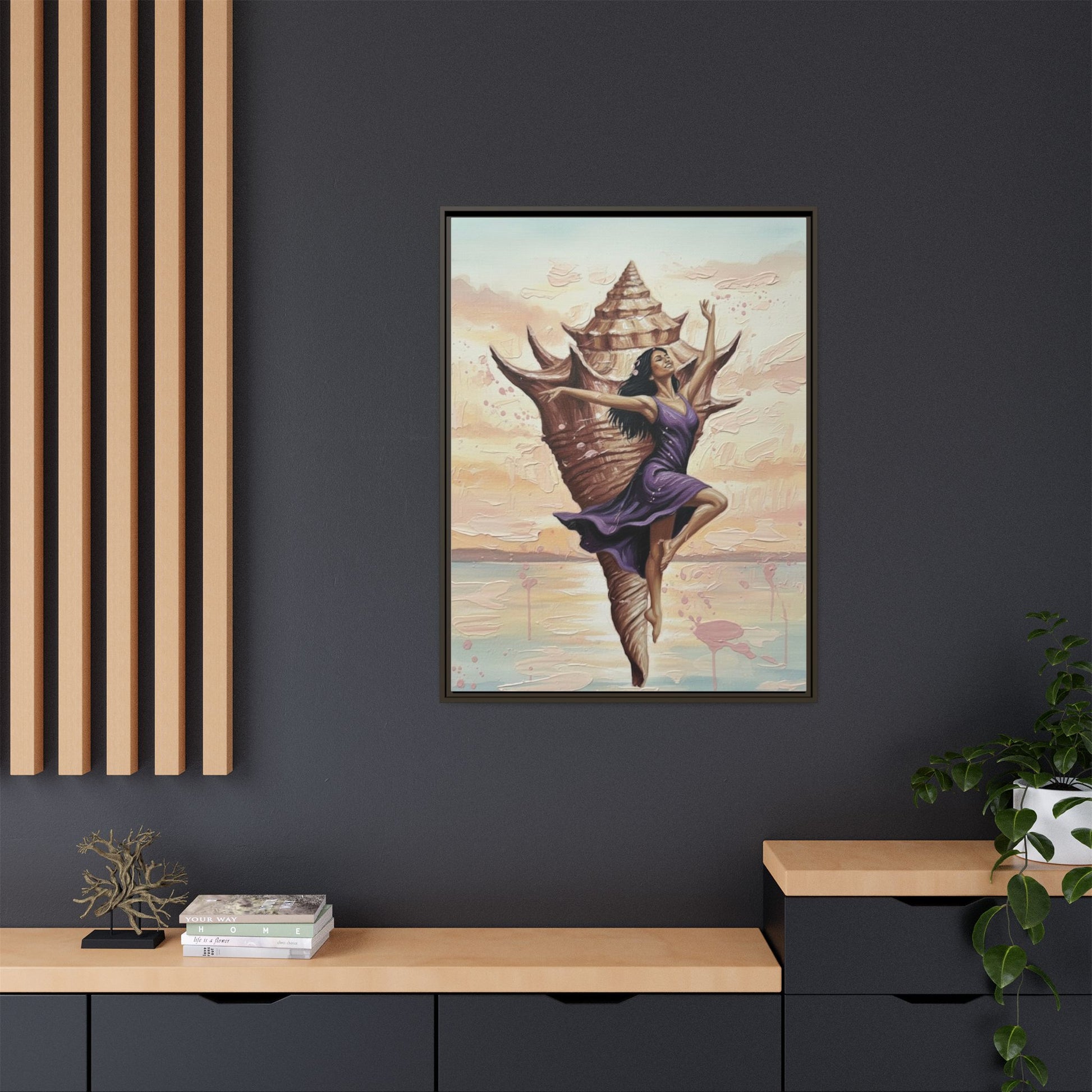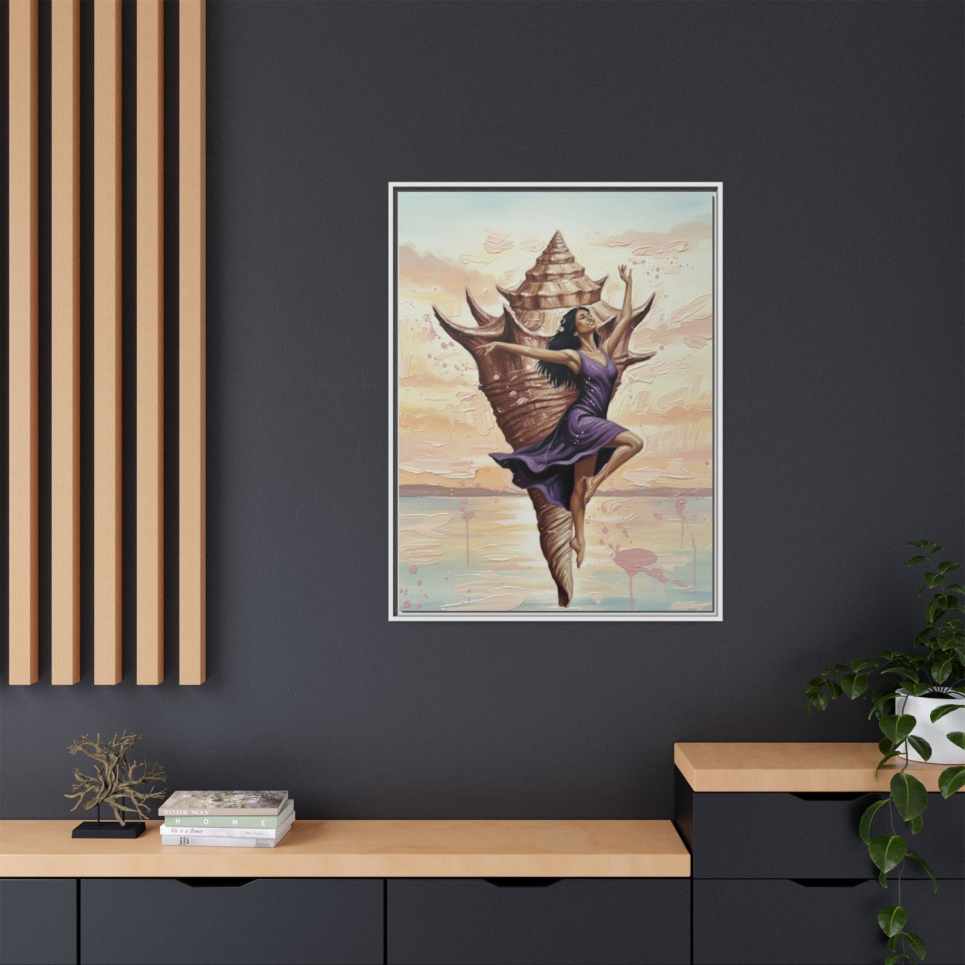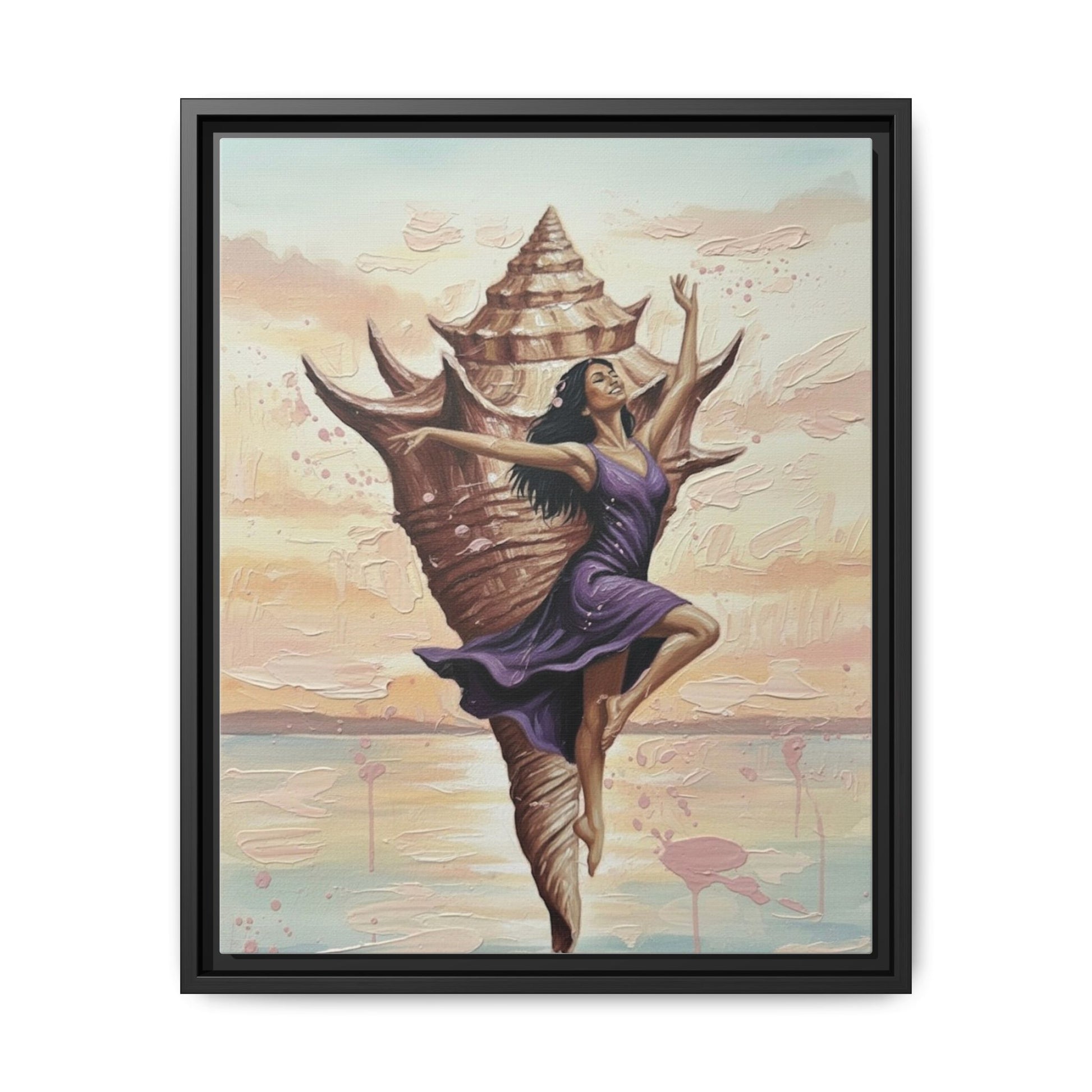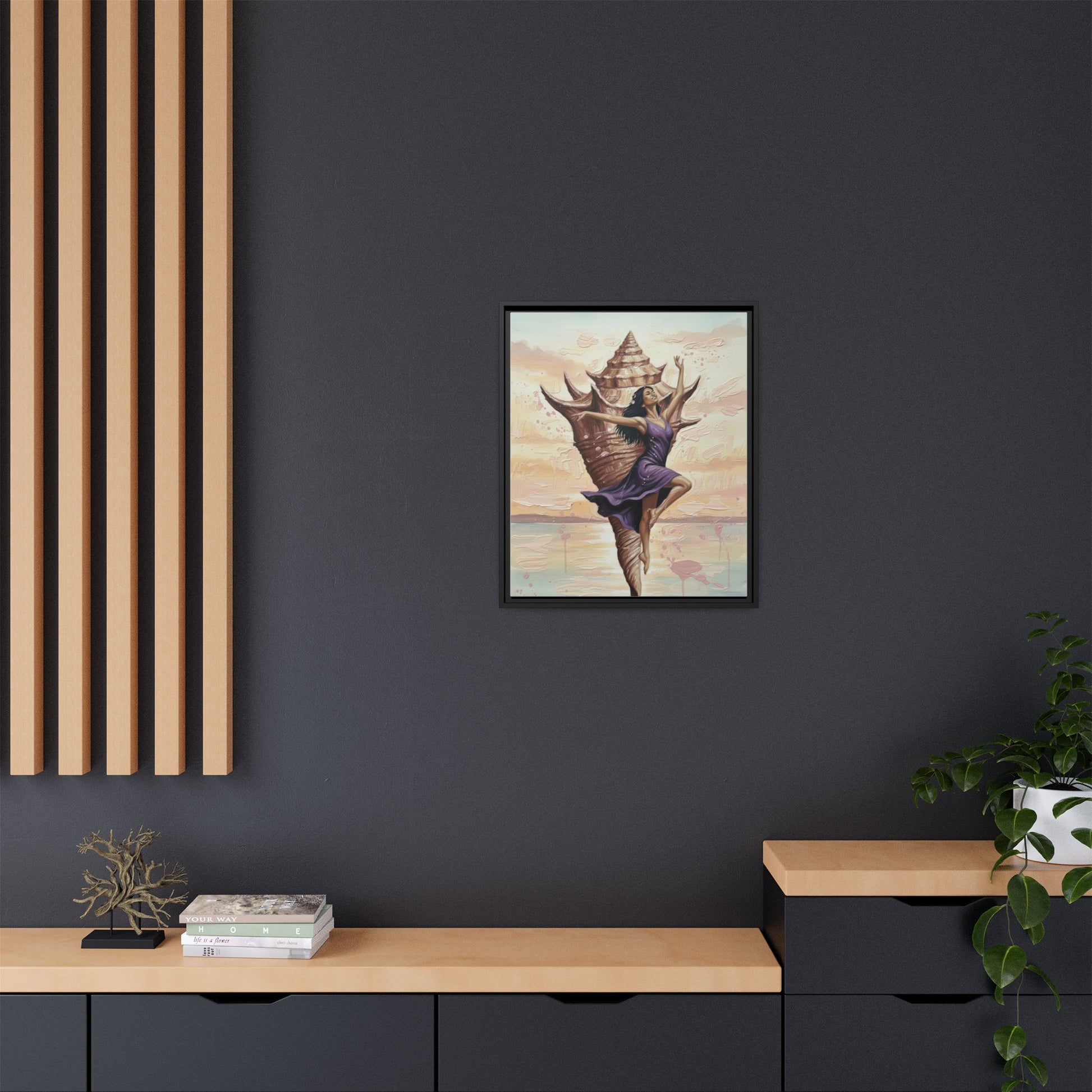 This framed matte canvas brings a quiet, seaside reverie into your space. A figure emerges from a spiraled conch, arms open as if greeting sea-salt air and the slow drift of dawn. Soft pastels and painterly textures give the scene an artful, contemplative energy — it reads like a memory of ocean light and wind, not just an image on a wall. Hung above a reading chair or in a sunlit hallway, the print invites long looks and gentle breaths. The slim black frame and matte surface keep reflections low and colors rich, so the artwork feels intimate and present every day.